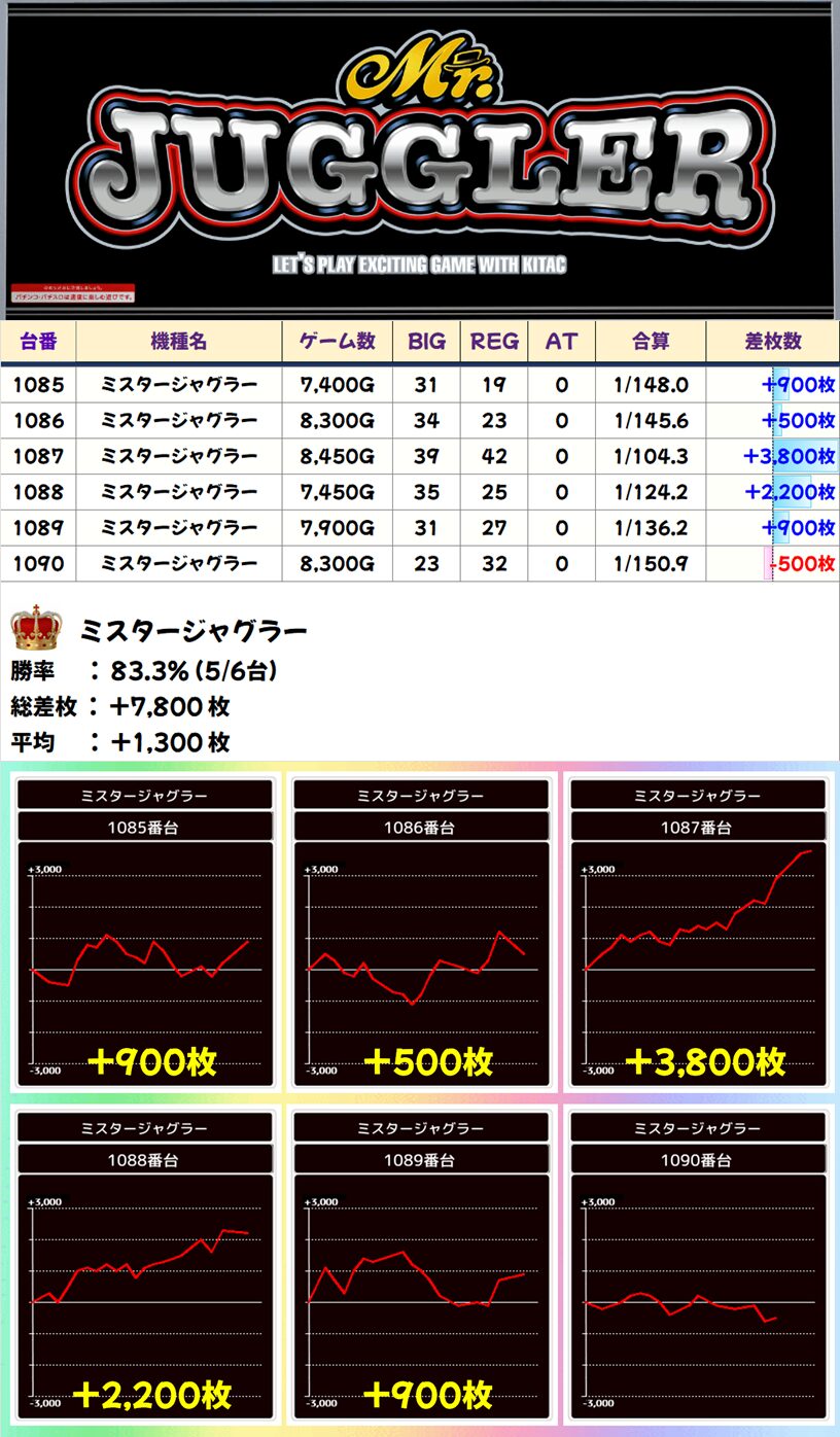 ミスタージャグラー (5/6台+) ➡平均 +1,300枚