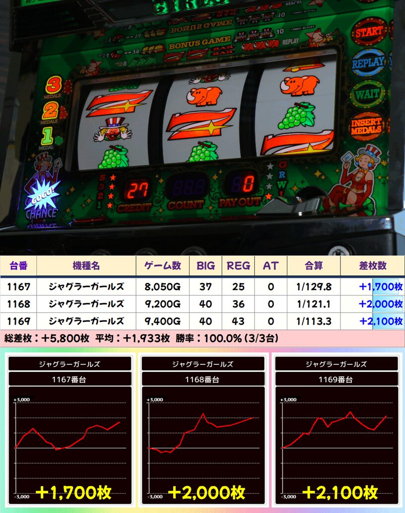 【3台並び】ジャグラーガールズ(1167-1169):平均+1,933枚