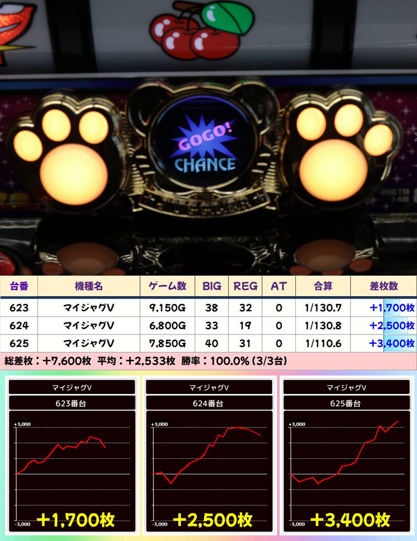 【3台並び】マイジャグV(623-625):平均+2,533枚