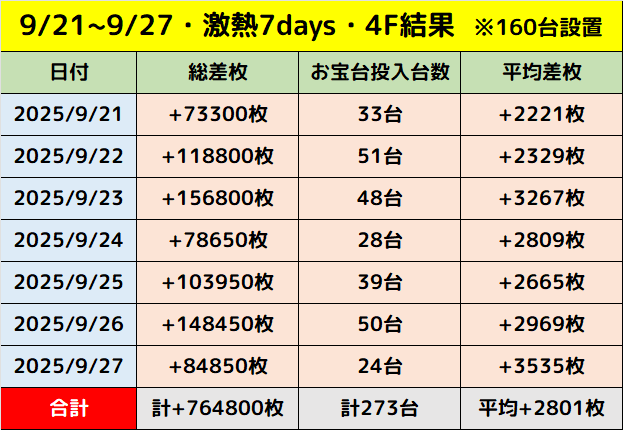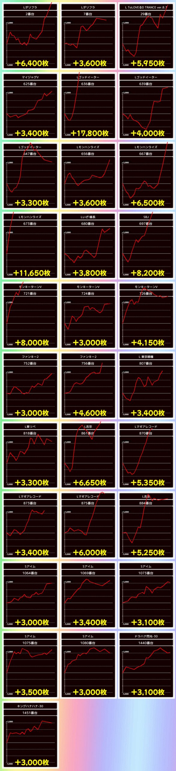 万枚超も2台出現し、その他にも+2000枚超が大量!今回も4Fのほぼ全台が1回以上優秀となる結果に!