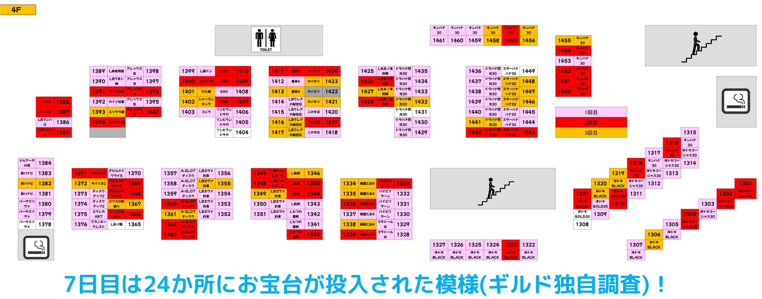 7の日は3台以上機種にお宝台があることが恒例となっておりますが、激熱7days中はそれ以外にも日付け末尾やパーフェクトフロアなど仕掛けが出現する傾向あり!