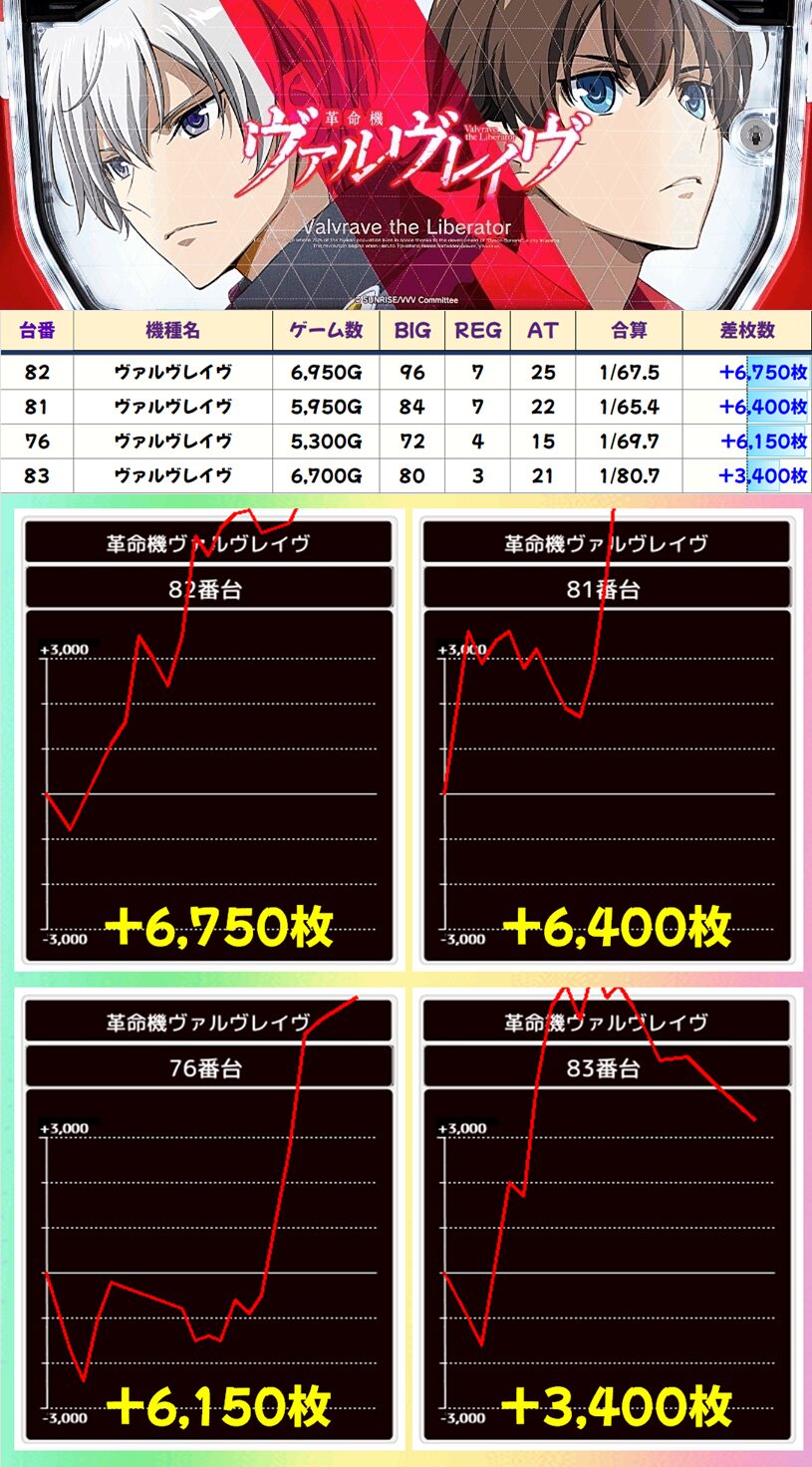ヴァルヴレイヴからは6000枚超の爆裂台が3台!合計4台の優秀台を確認できました。