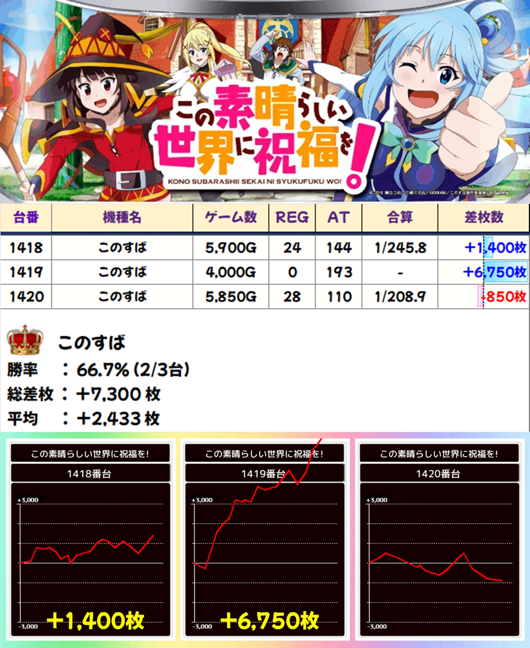 かぶぱポストにダブルでヒントがあったサミー機種のこのすばは+3200枚、+1500枚のプラスを確認できましたが、1台がかなり大きく沈んでしまいました。こちらの不発の影響でトータルでも若干のマイナスとなってしまいました…。