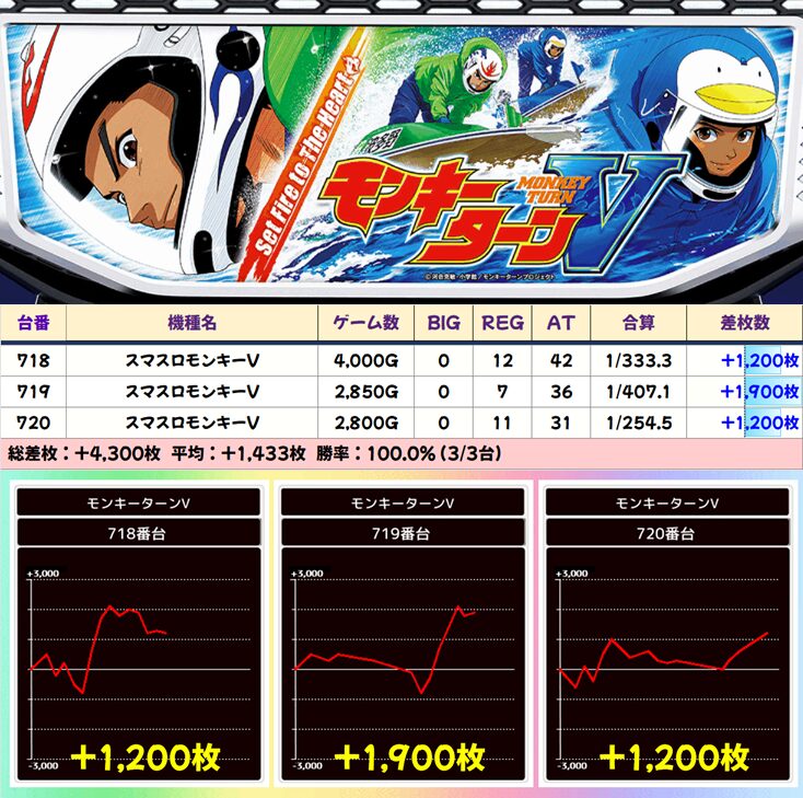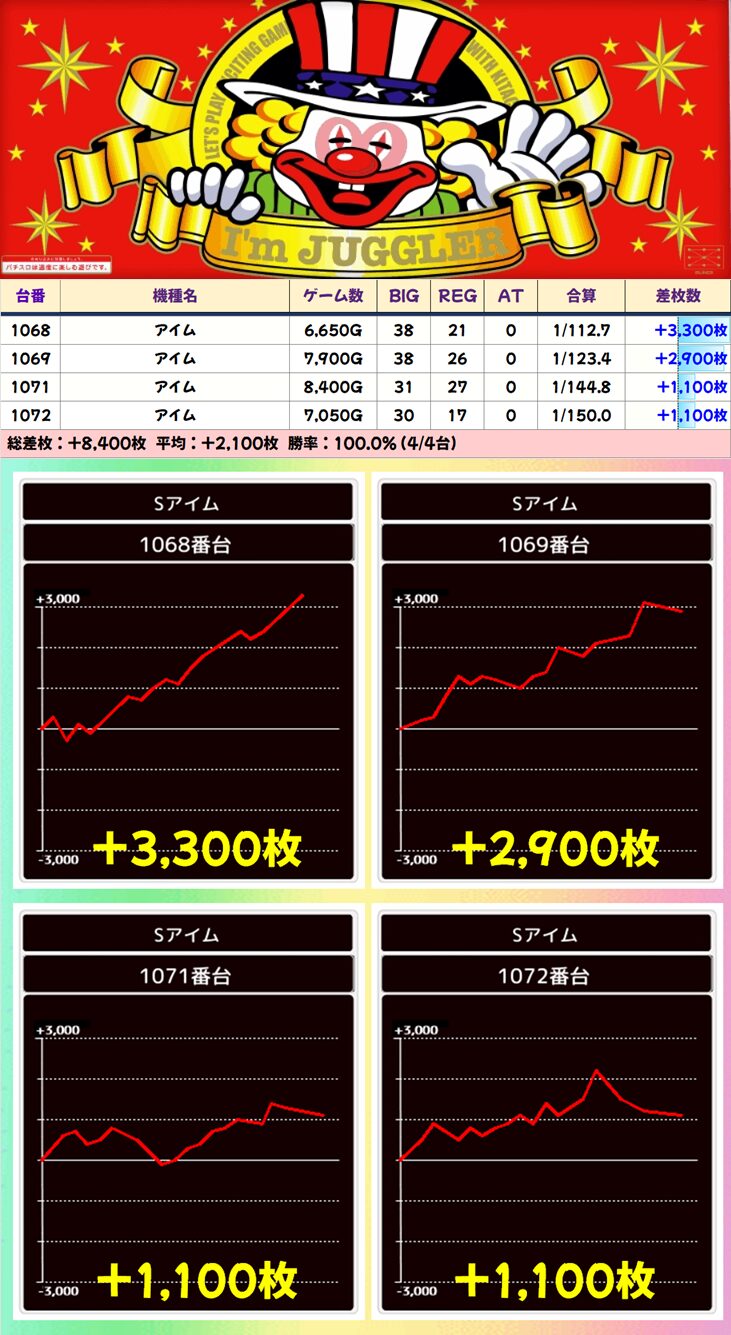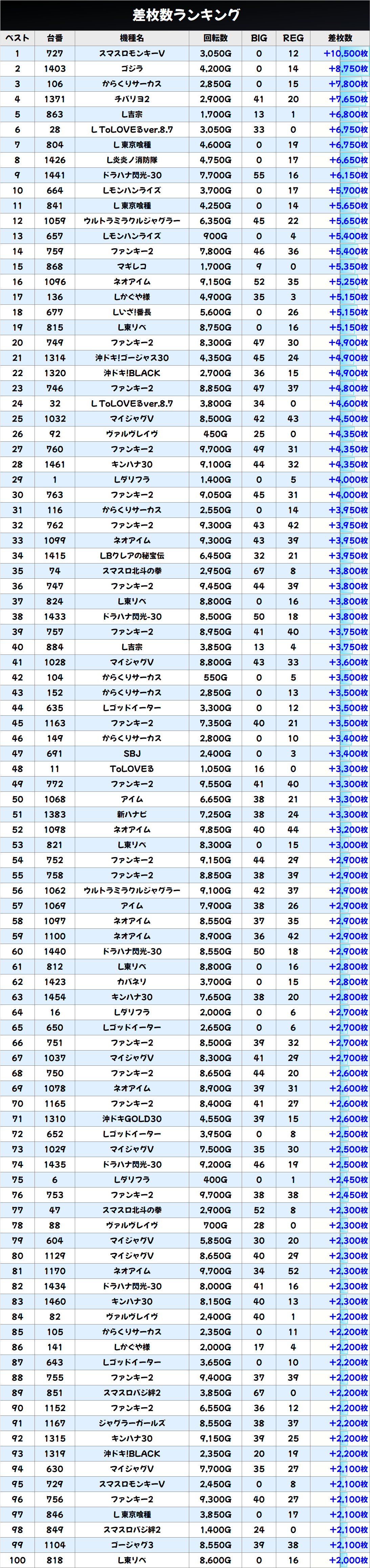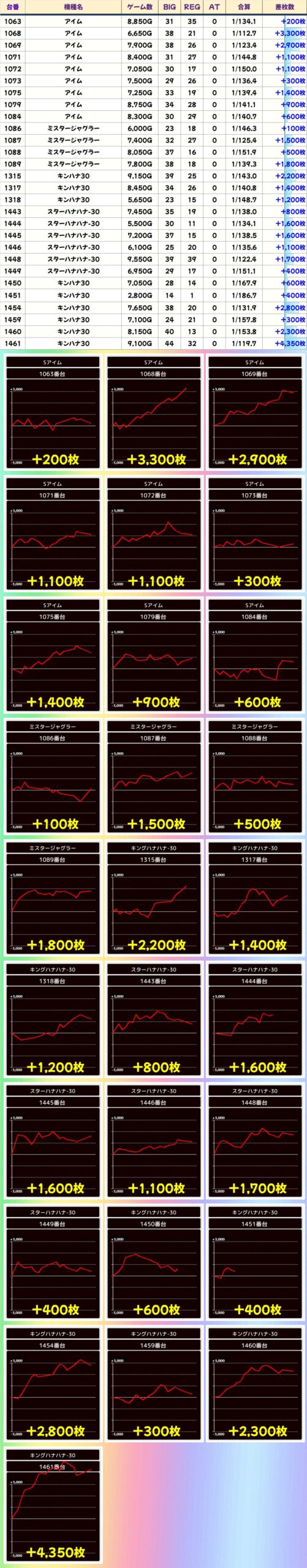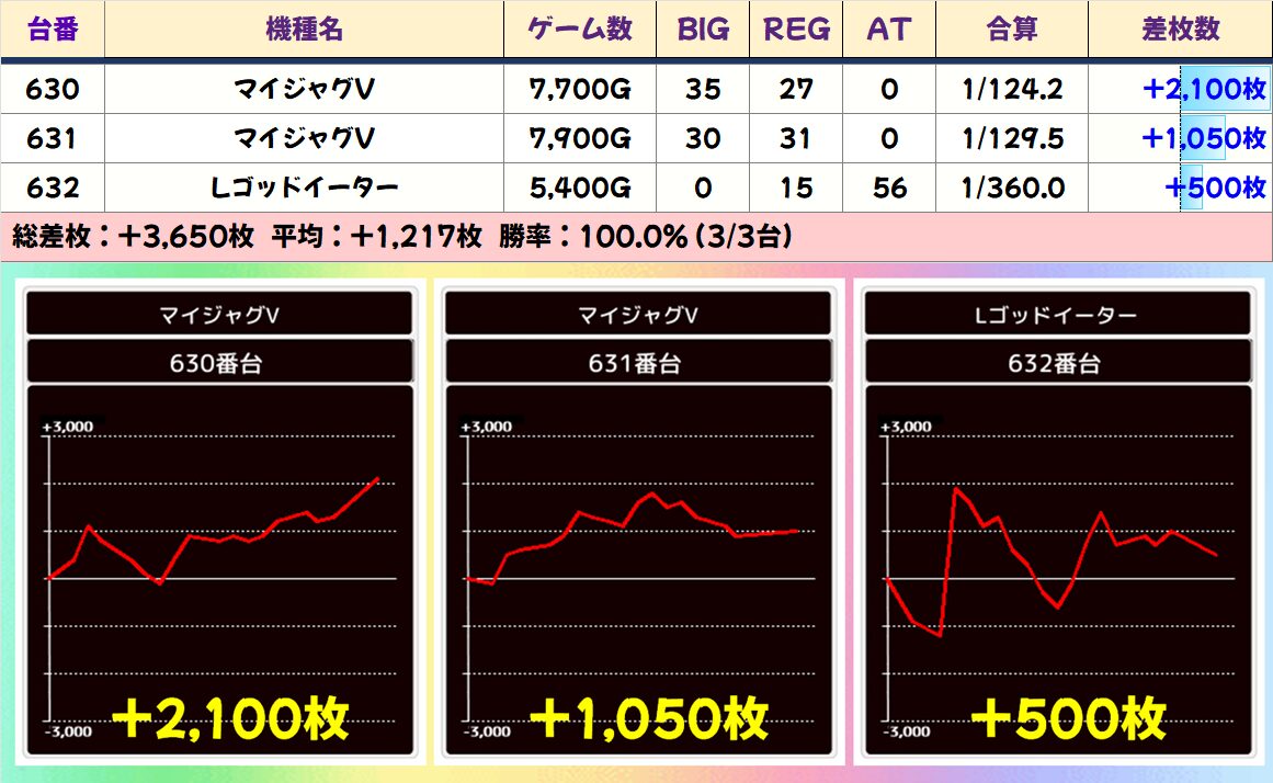 今回も上記3機種の優秀台(+2000枚以上)をピックアップしていきます。データをチェックして明日以降の参考にしてください!