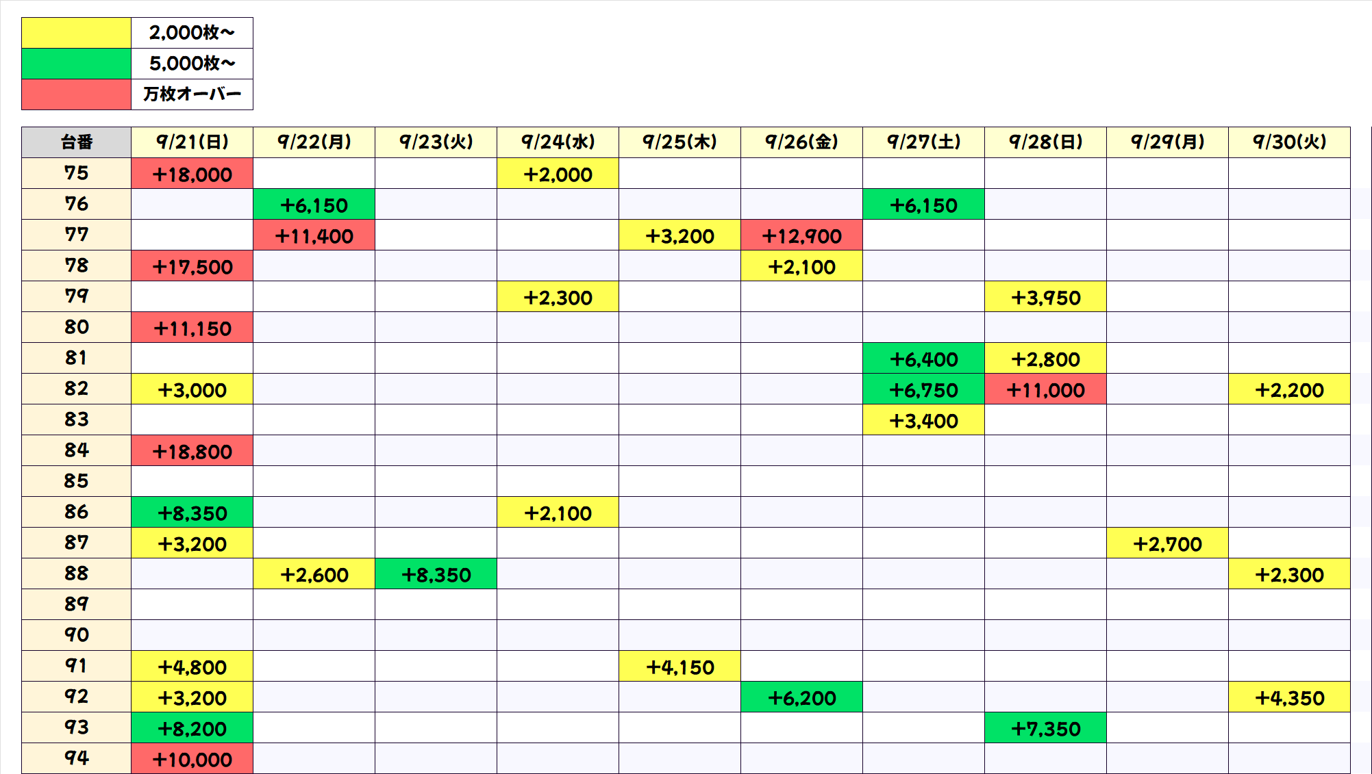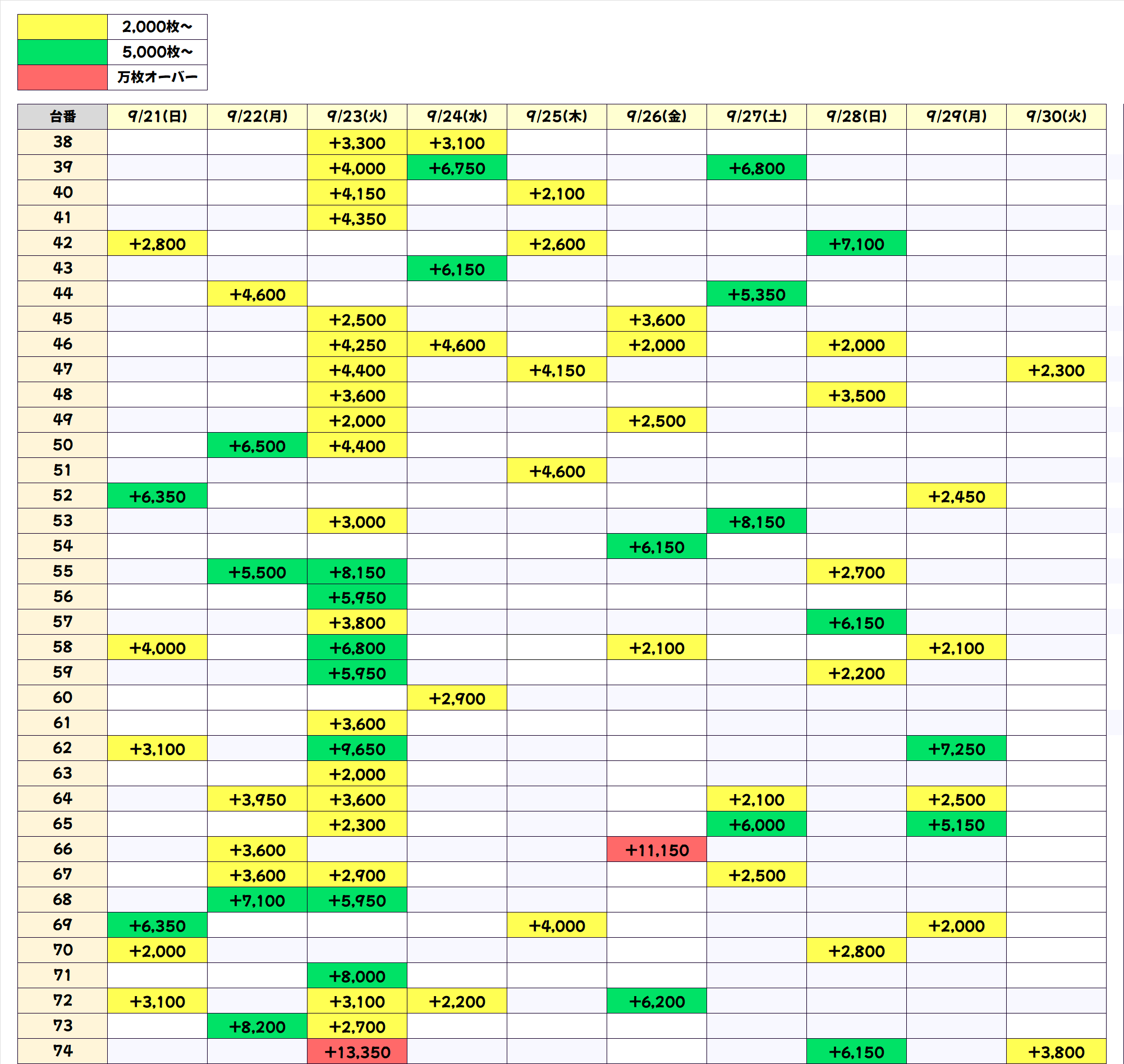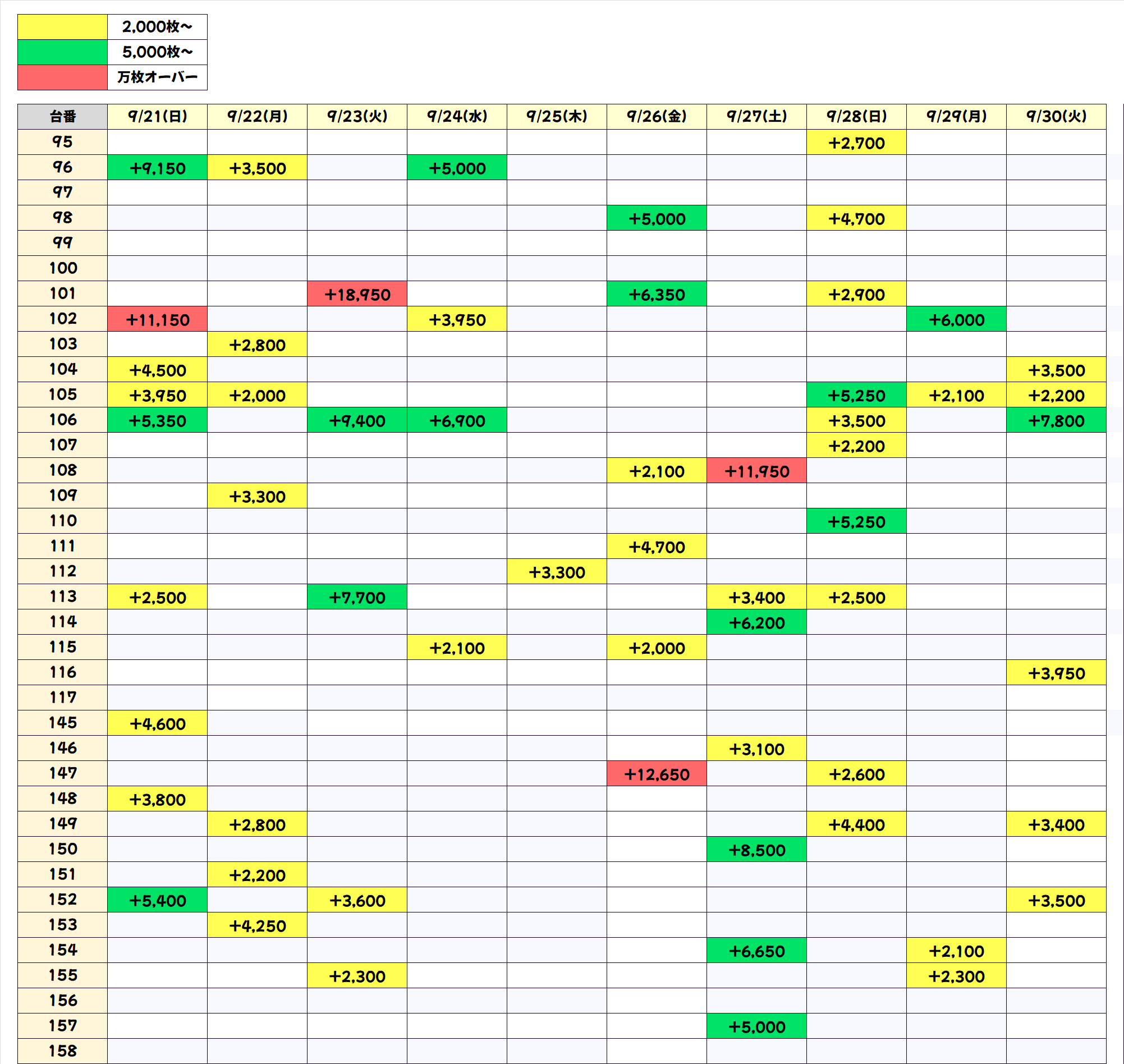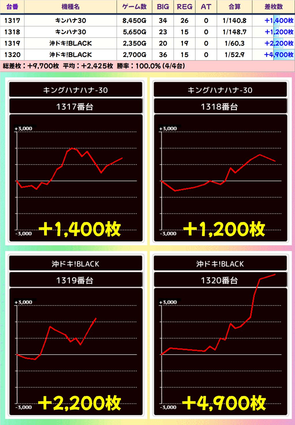 今回も上記3機種の優秀台(+2000枚以上)をピックアップしていきます。データをチェックして明日以降の参考にしてください!