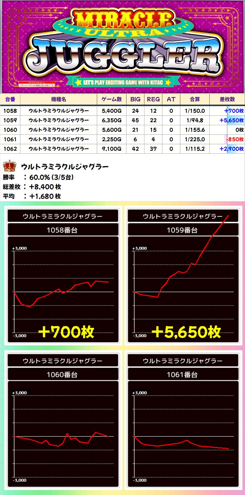 ウルトラミラクルジャグラー (3/5台+) ➡平均 +1,680枚