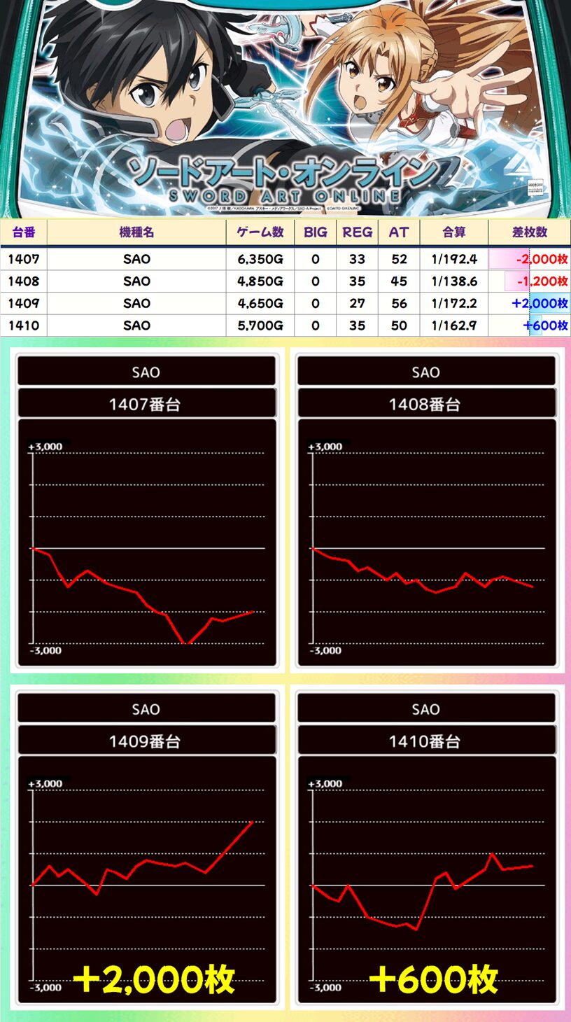 ファンキーは2Fフロアが全台系濃厚で全台プラスという超優秀な結果!ネオアイムもウルミラも好結果を残しています。安定感のある機種に仕掛けが入るのはうれしいですね。SAOもおそらく仕掛けが入っていましたが、若干不発な結果に…