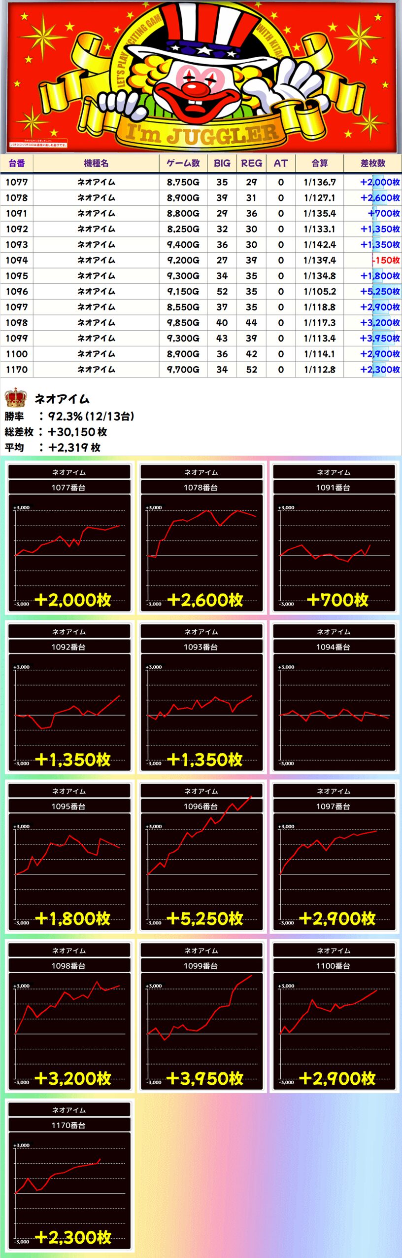 ネオアイム (12/13台+) ➡平均 +2,319枚