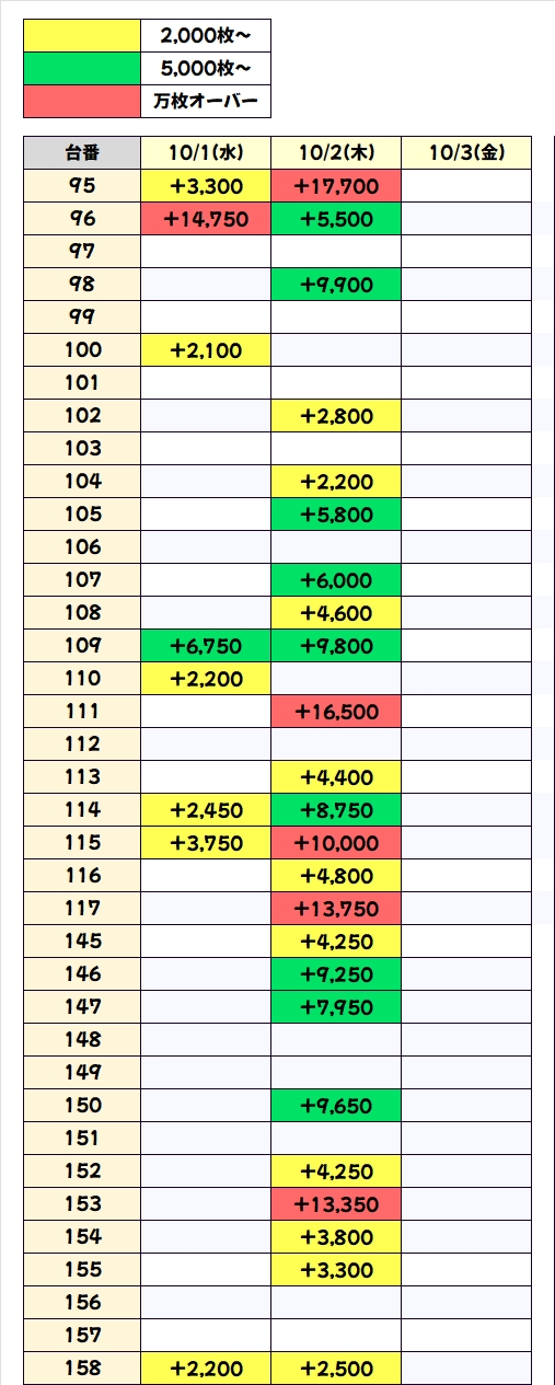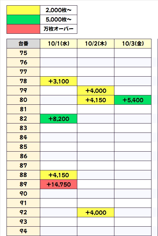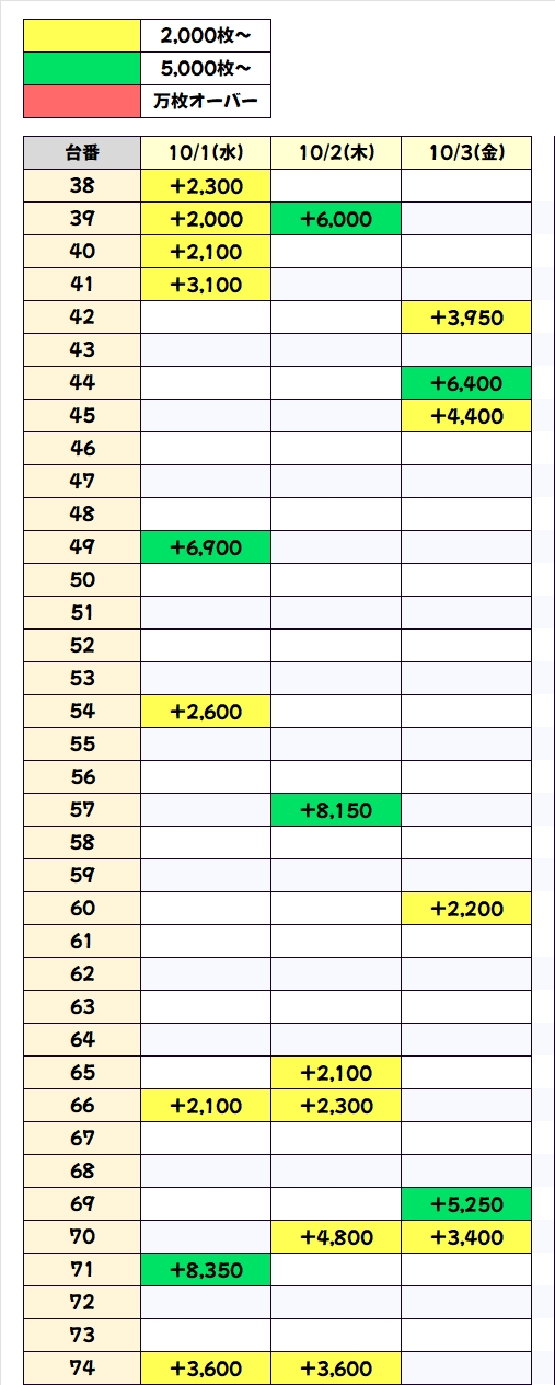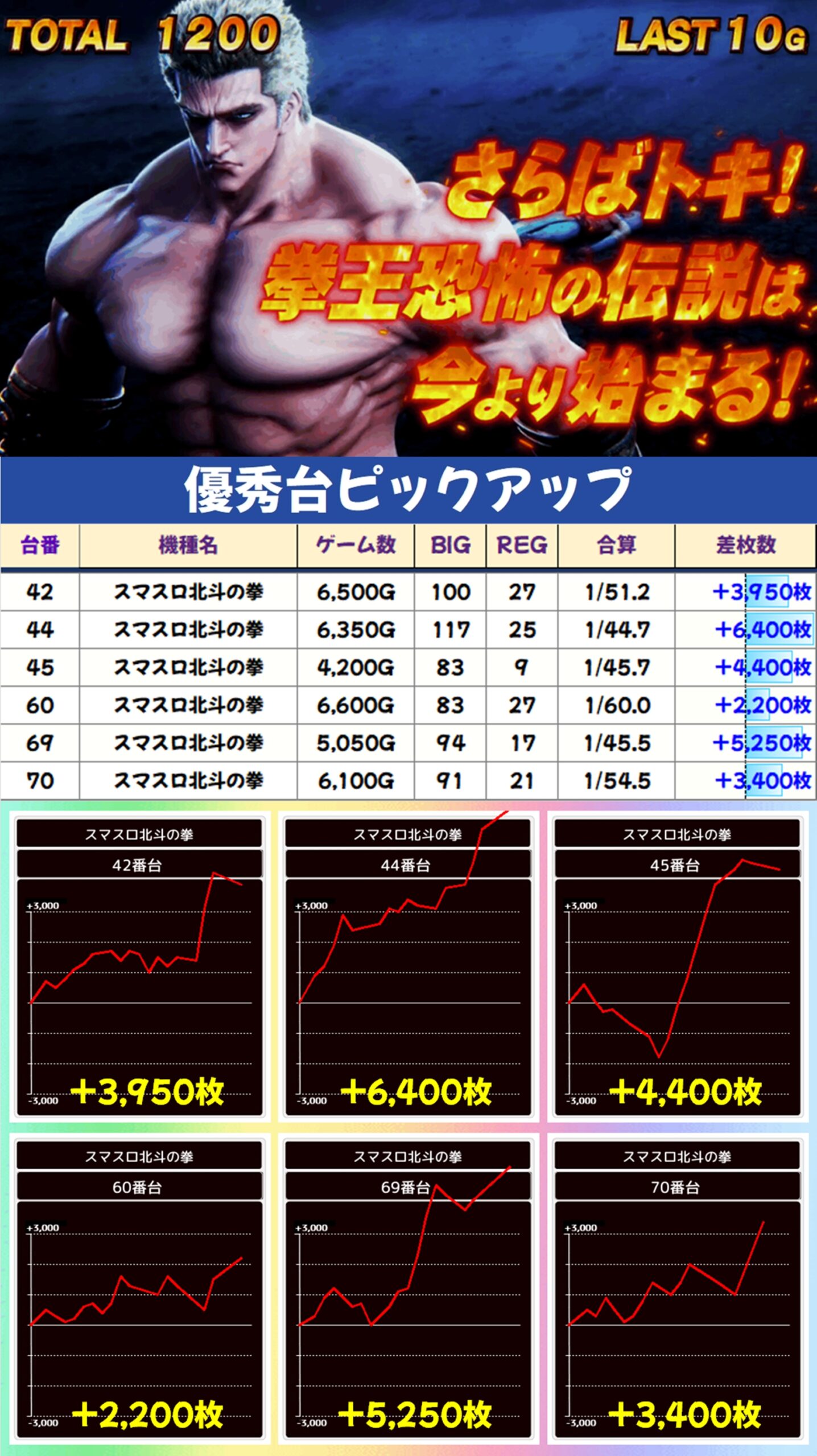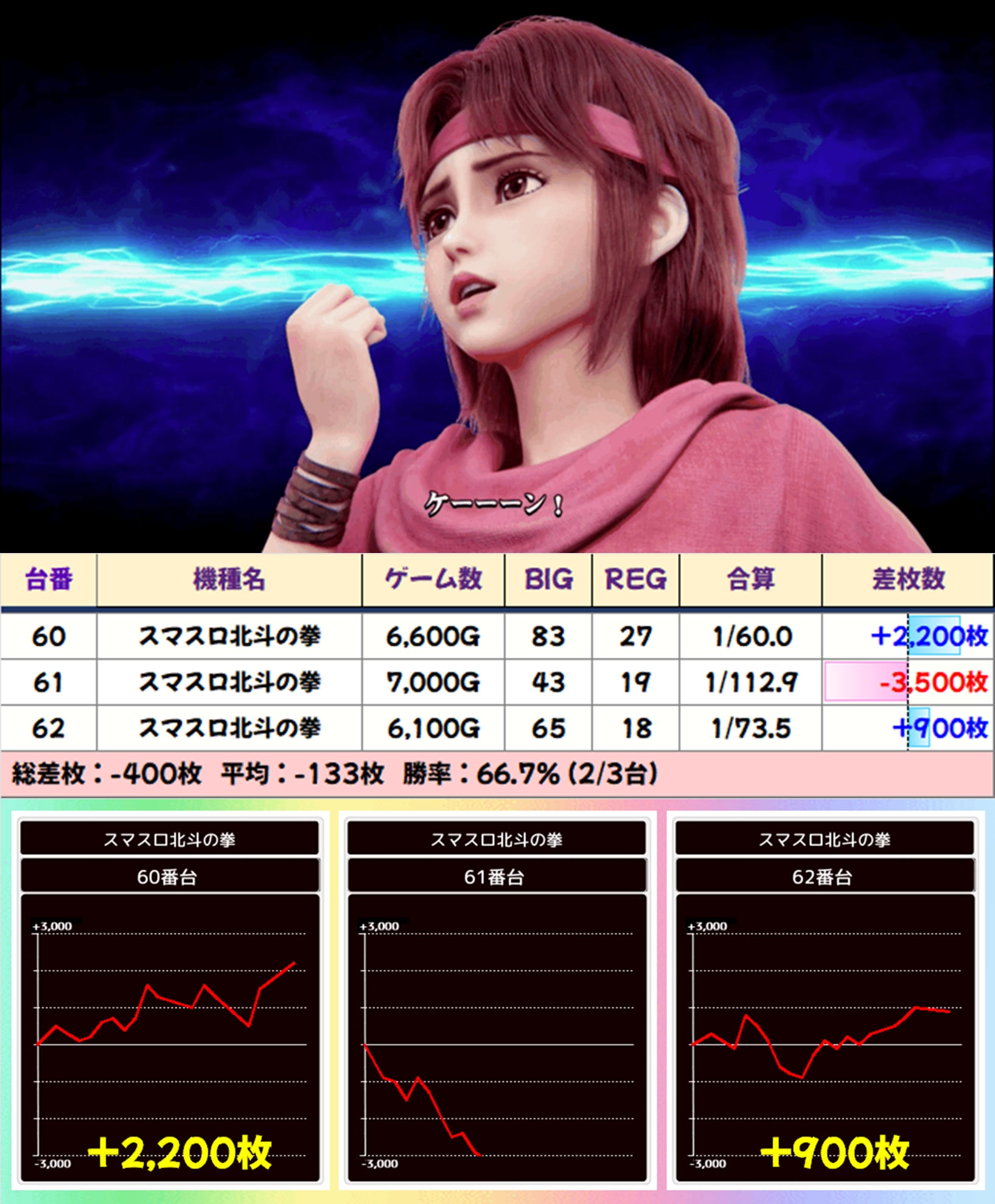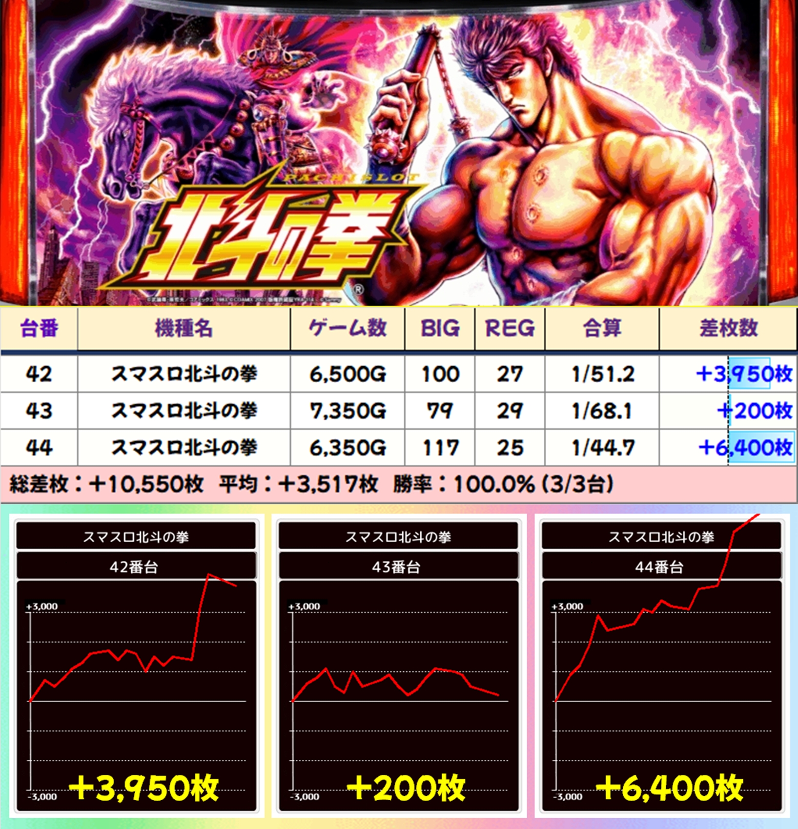 今回はスマスロ北斗の拳に並びの仕掛けが3か所ありましたが、それらも含めて3機種の優秀台(+2000枚以上)をピックアップしていきます。データをチェックして明日以降の参考にしてください!