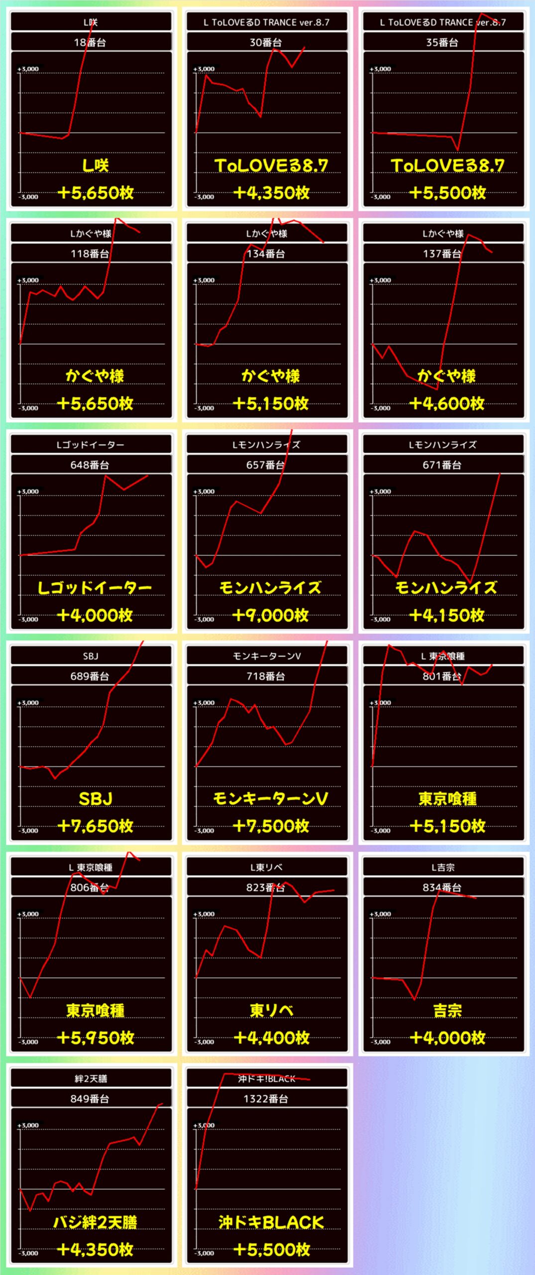不発の台や大幅なマイナスとなってしまった台もありましたが、いずれもしっかり打ち込まれていたため、お宝台であることはもちろんのこと並びの仕掛けがあったことも打ち手には分かっていた可能性が高いですね。