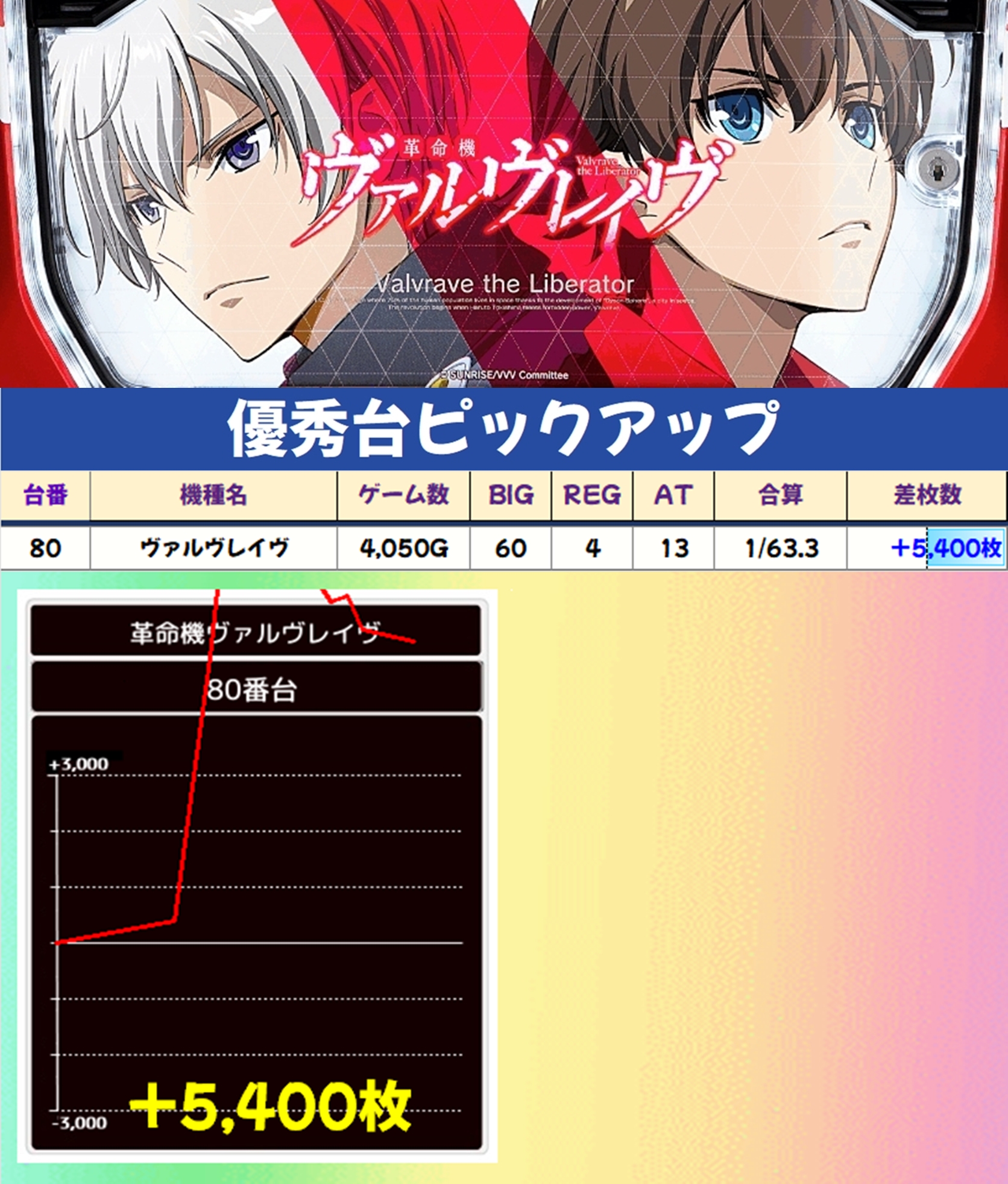 ヴァルヴレイヴも不発気味でしたが、+5400枚の大量出玉を確認できました。
