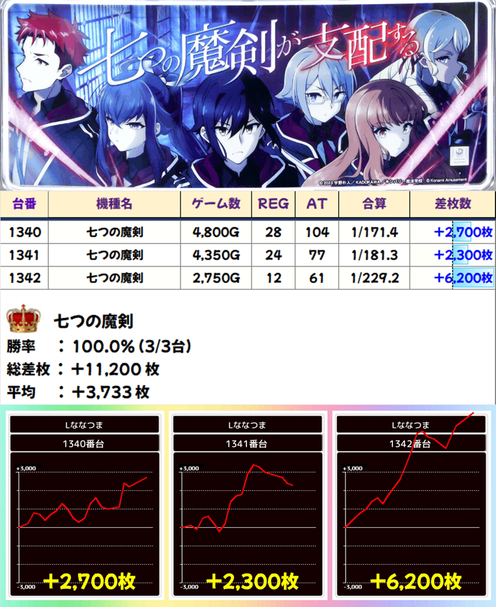 かぶぱポストにヒントがあった七つの魔剣は+6200枚の大量出玉が出現かつ全台がプラスの結果に。平均+3733枚と見事な成績を残しましたね!