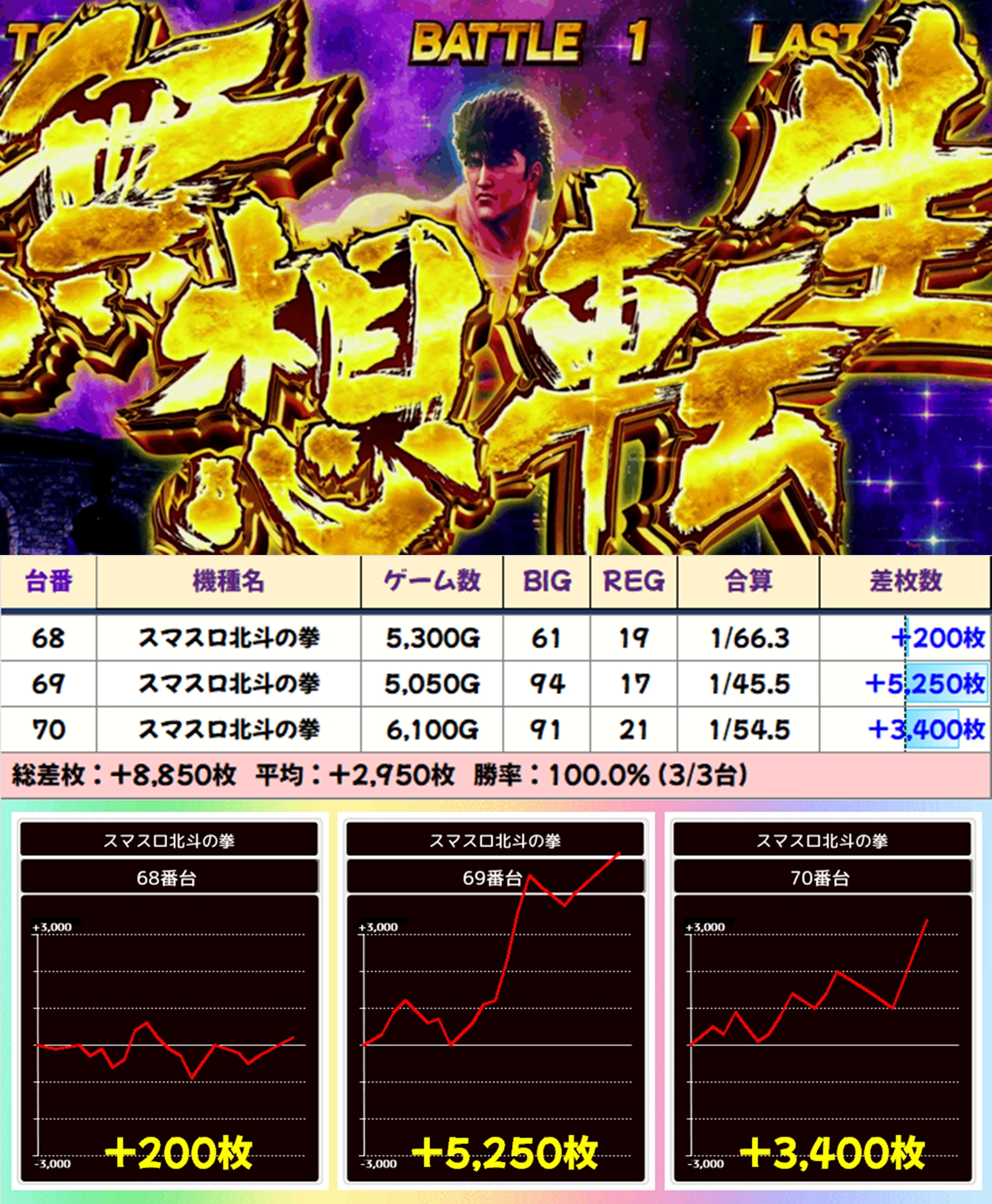 【3台並び】スマスロ北斗の拳(68-70番台)→平均+2,950枚