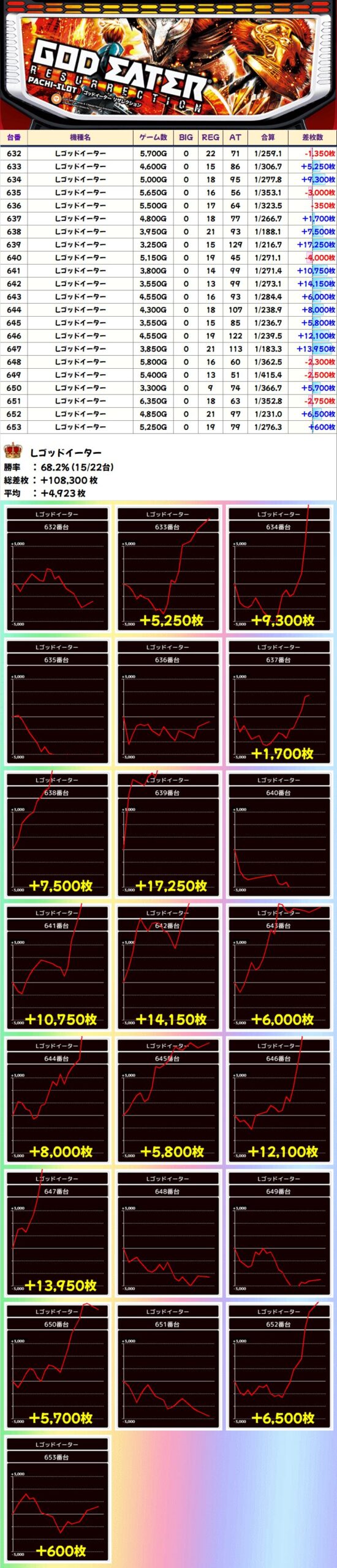 なんとゴッドイーターは5台が万枚を超えるという素晴らしい結果!マイナスの台もありますが平均差枚は5000枚と圧巻です。