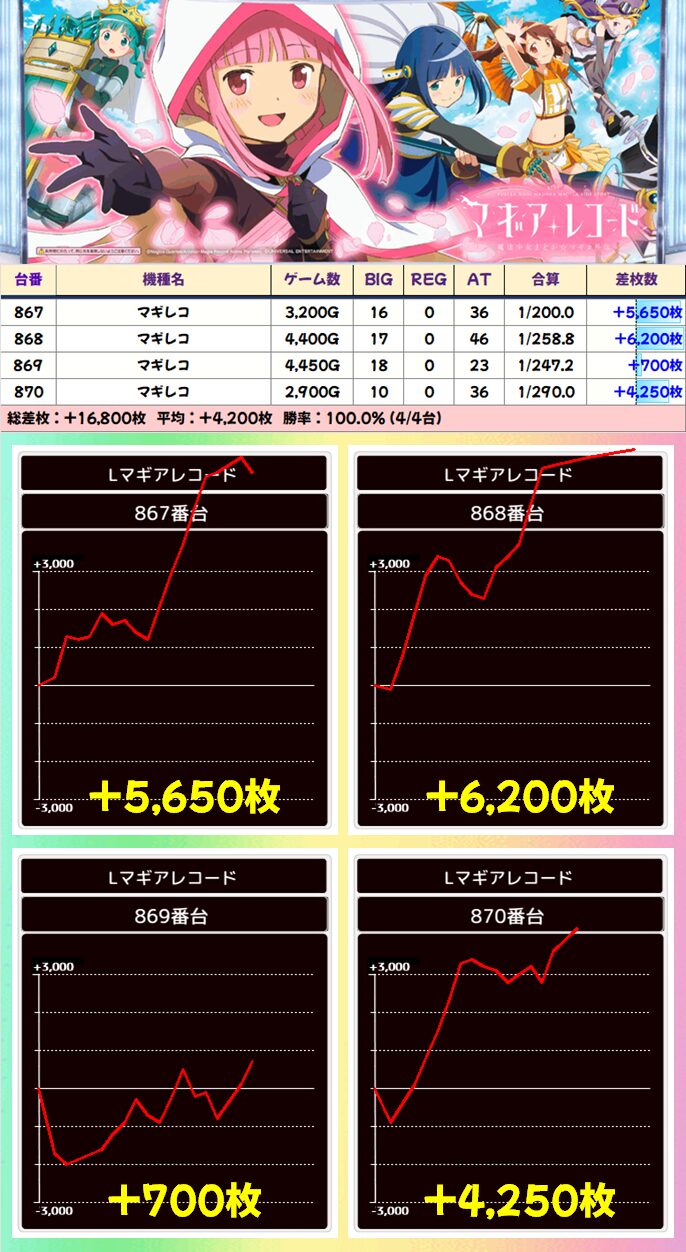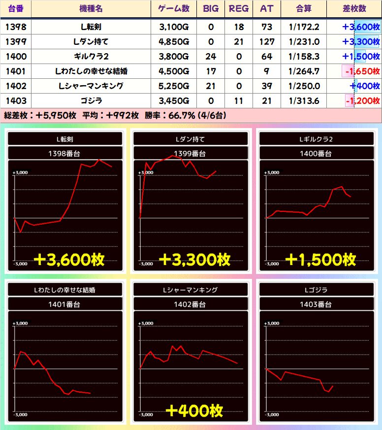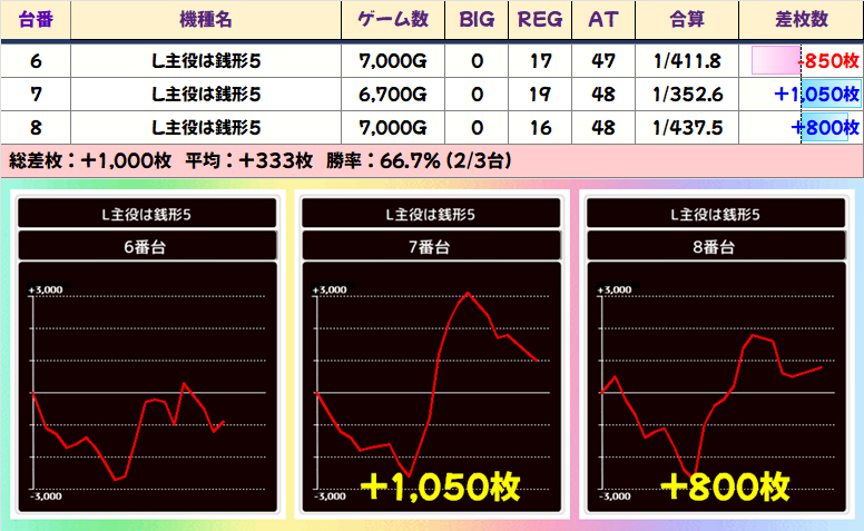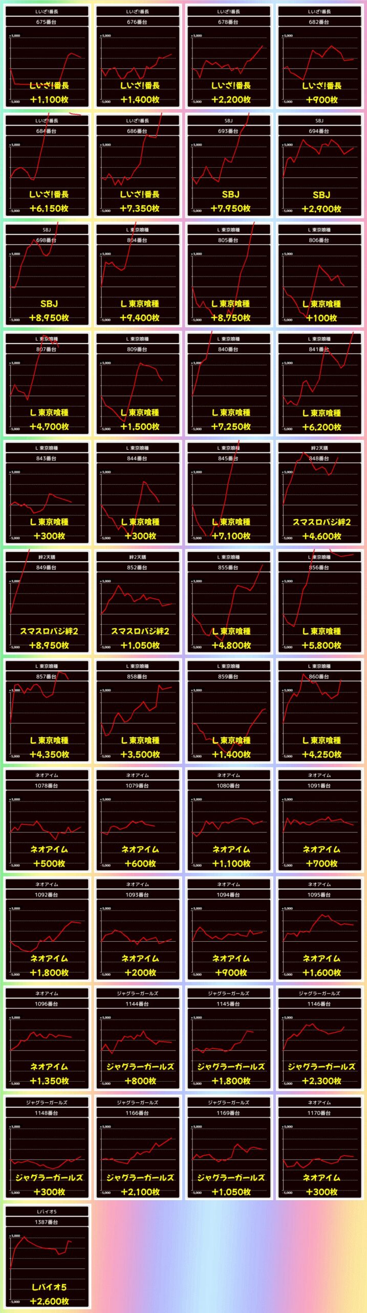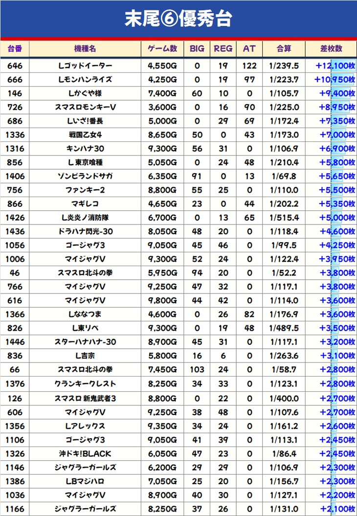 毎月6日は末尾⑥番台の仕掛けが恒例となっており、今回も末尾⑥番台からお宝台を多数確認。平均で+1,670枚の好結果!これだけで総差枚は+12万枚です!
