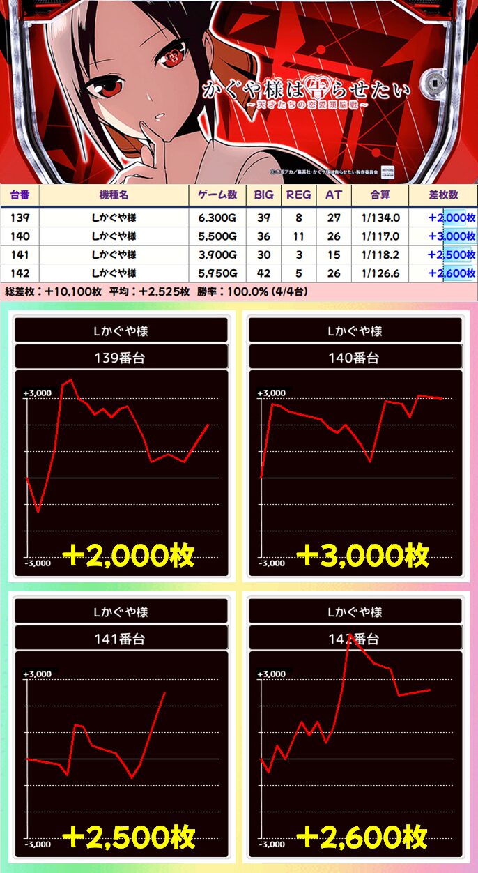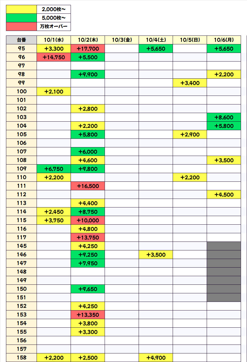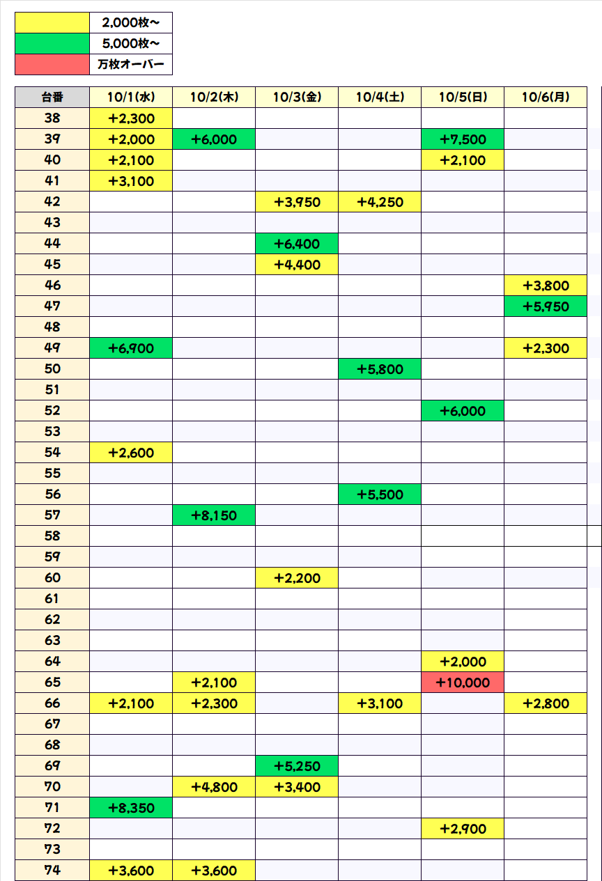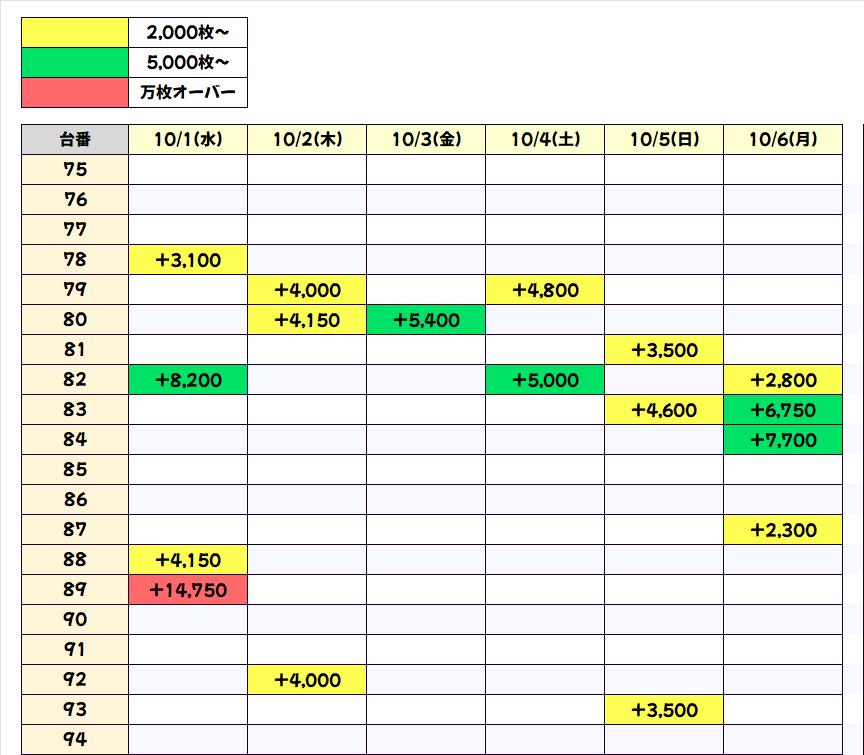 毎月6日は末尾⑥番台の仕掛けが恒例となっており、今回も末尾⑥番台からお宝台を多数確認。平均で+1,670枚の好結果!これだけで総差枚は+12万枚です!