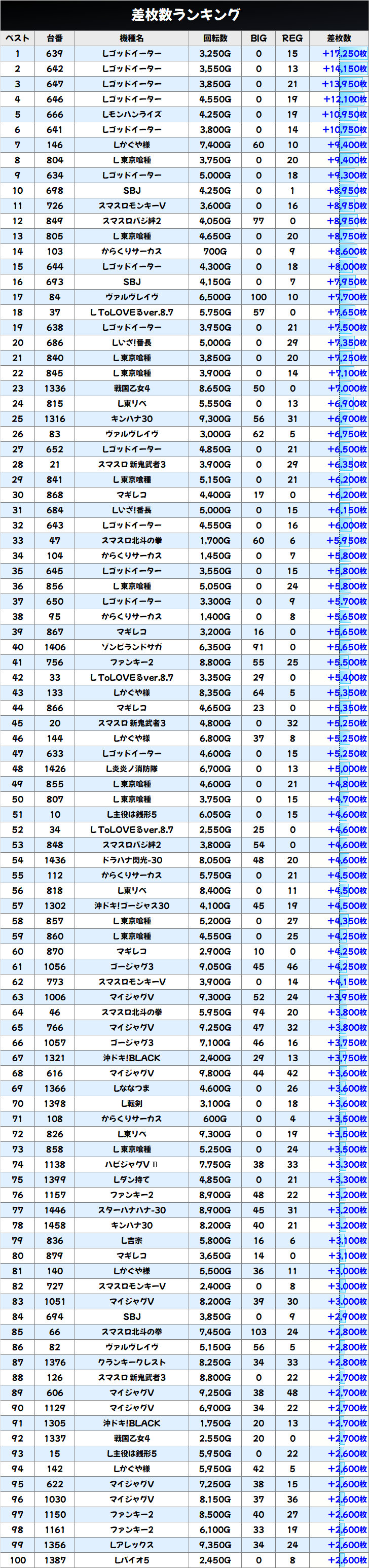 今回も各機種の優秀台(+2000枚以上)をピックアップしていきますので、データをチェックして立ち回りの参考にしてください!