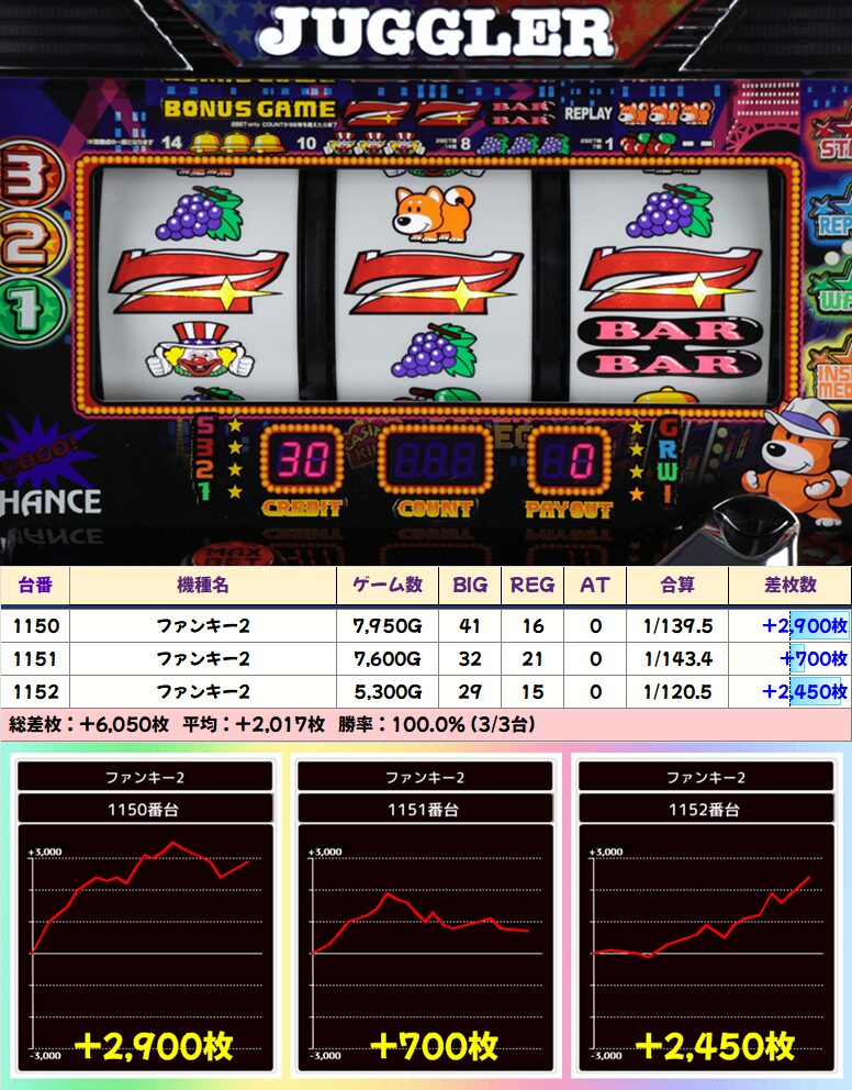 ファンキージャグラー2【1150–1152】 ➡ 平均 +2,017枚