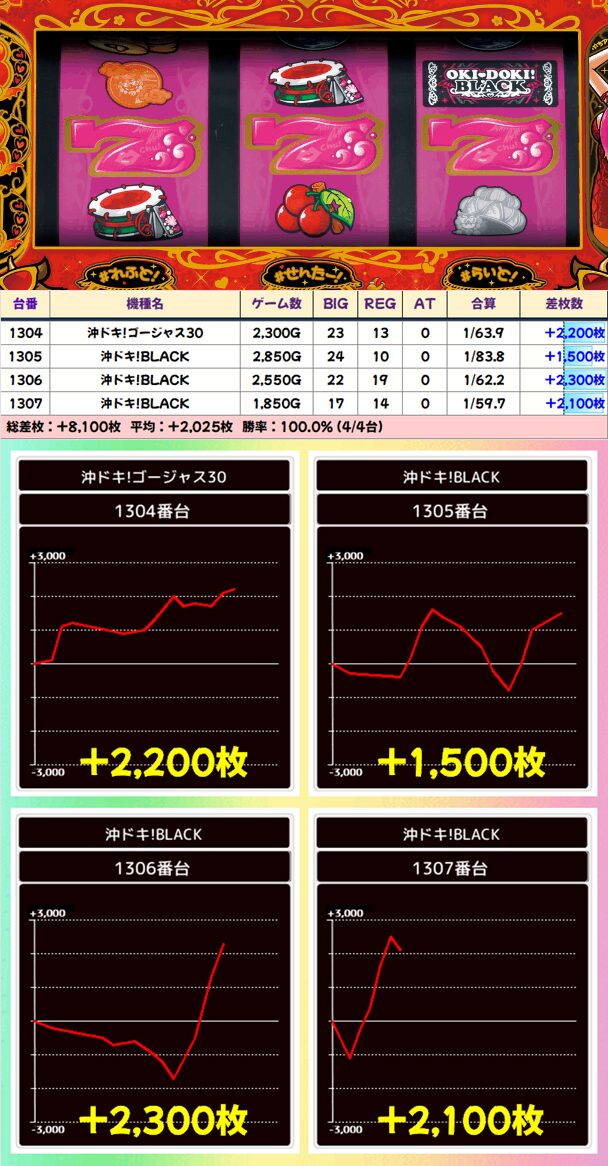 沖ドキ!ゴージャス30+沖ドキ!BLACK【1304–1307】 ➡ 平均 +2,025枚