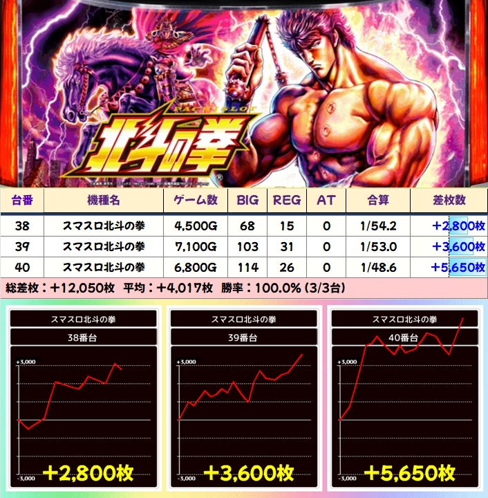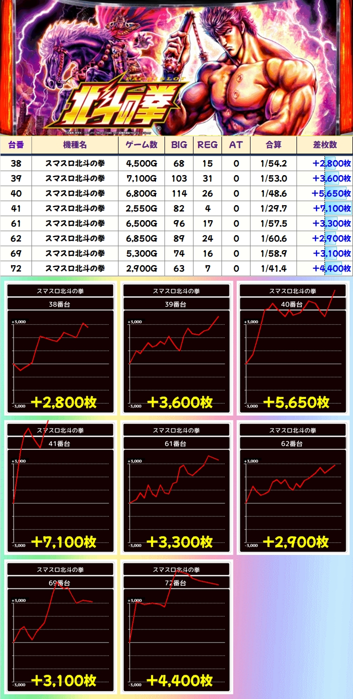 「スマスロ北斗」からは大量出玉が複数出現しており、+7100枚を筆頭に+5000枚オーバーや+4000枚オーバーなどの優秀台を複数確認することができました!