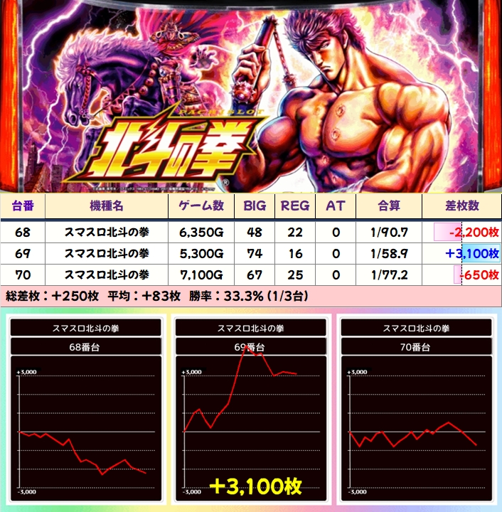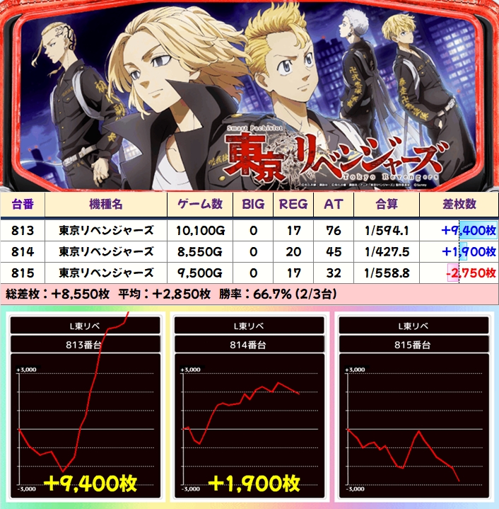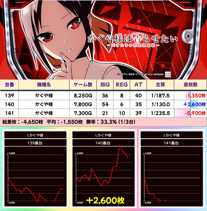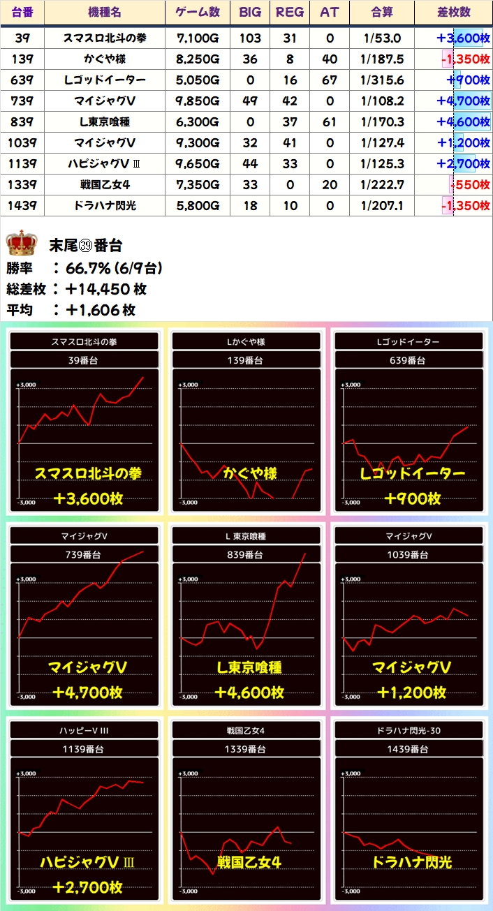 この日は『39の日』に絡めて末尾㊴が好結果になっており、平均+1606枚と大幅プラスを記録!