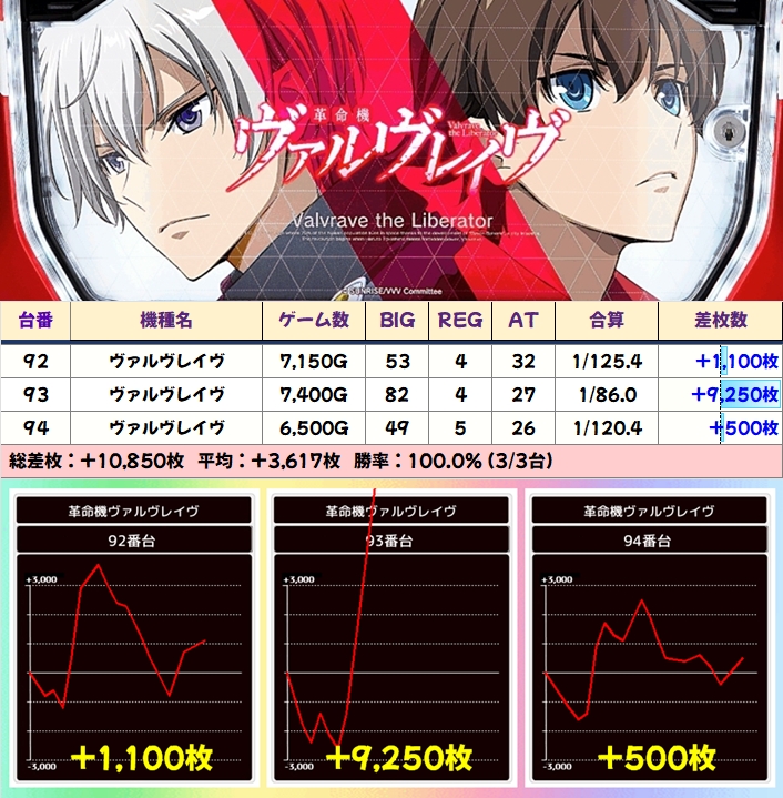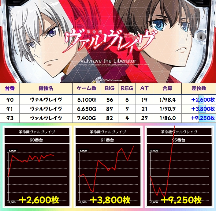 「ヴァルヴレイヴ」は+9000枚の大量出玉に加えて+3000枚オーバーなども出現していました!