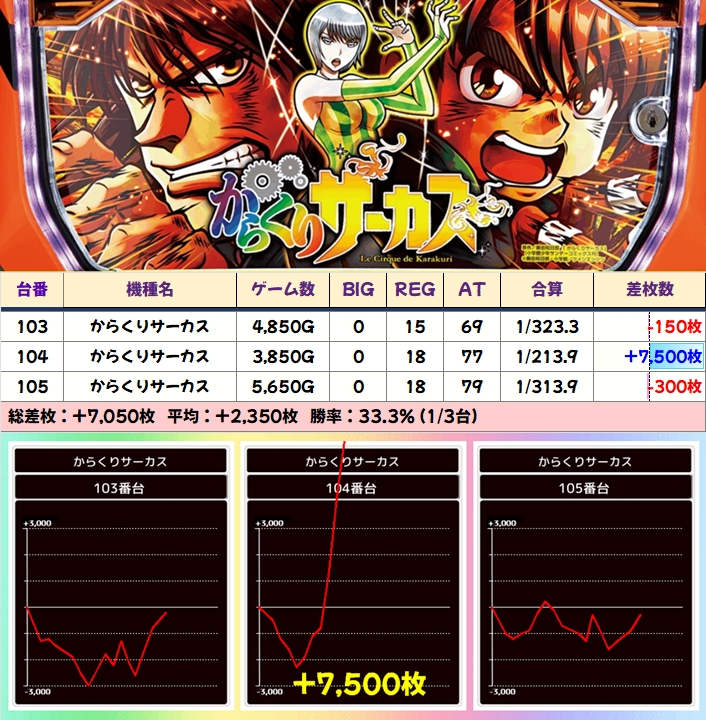 「からくりサーカス」からは+7500枚や+6750枚などの大量出玉に加え、複数の優秀台を確認することができました!