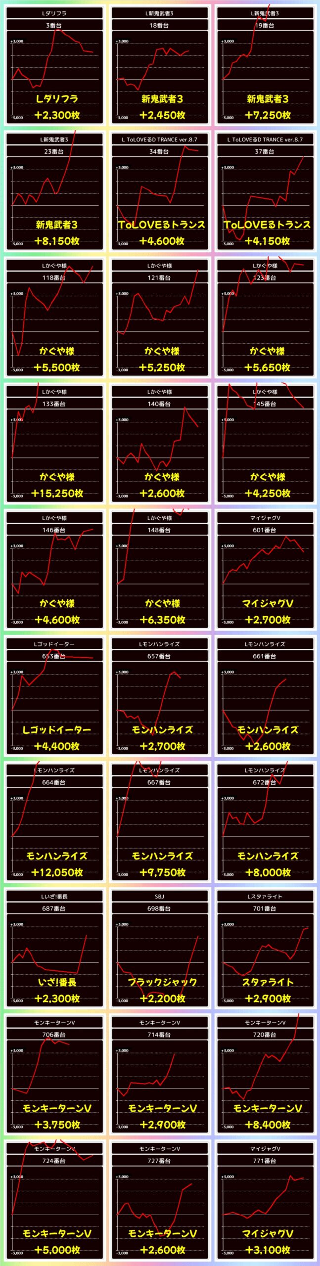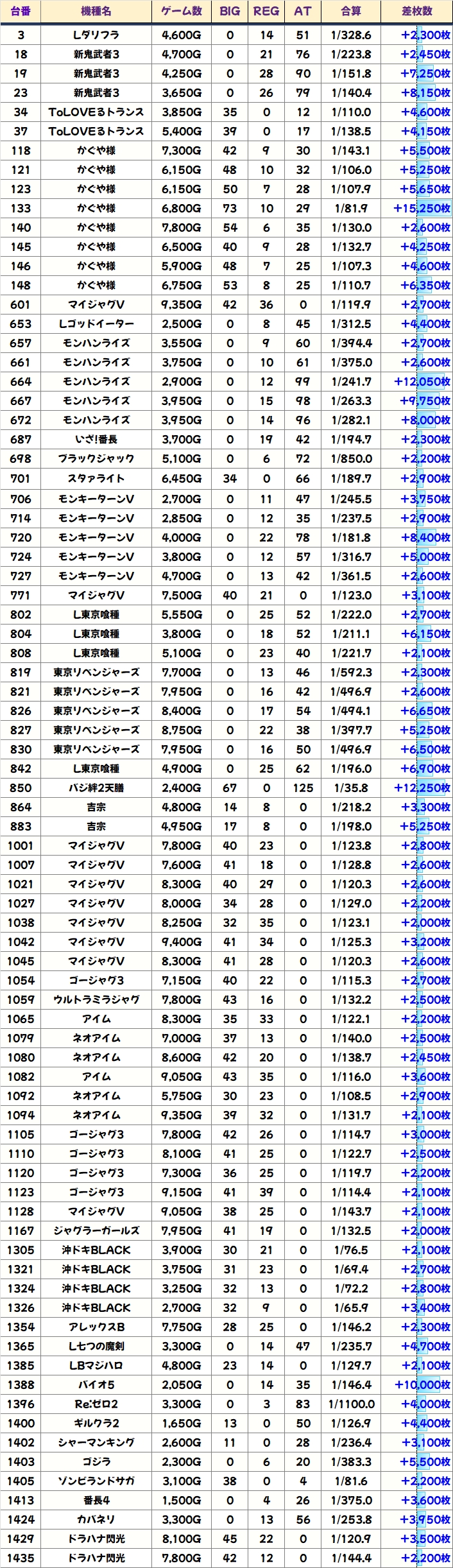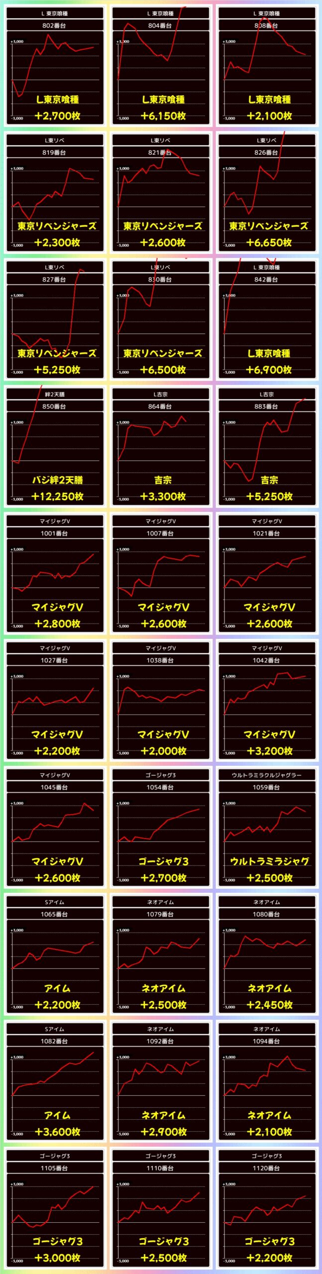 今回は各機種に並び仕掛けを確認できましたが、それらも含めて各機種の優秀台(+2000枚以上)をピックアップしていきます。