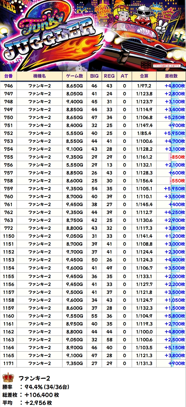 【全台系濃厚】ファンキー2(34/36台+)→平均+2,956枚
