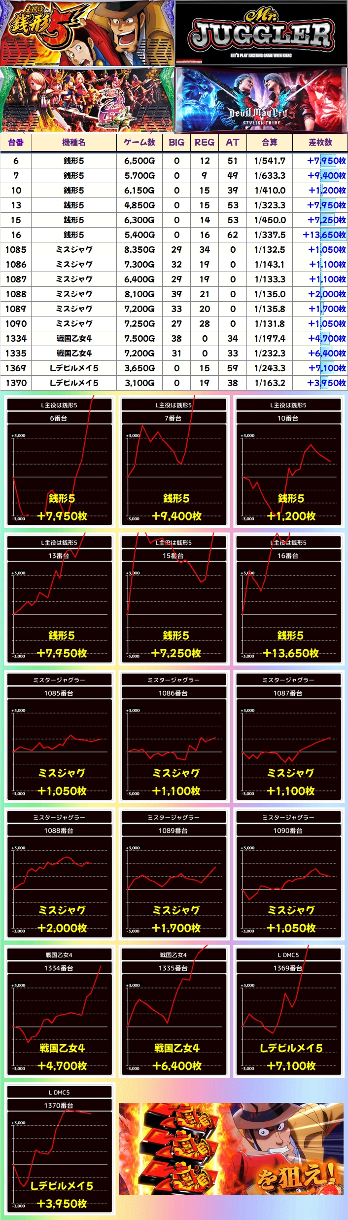 上記の機種からは+5000枚以上の大量出玉も複数確認することができ、新台の「銭形5」からは+136500枚の万枚オーバー台が出現!