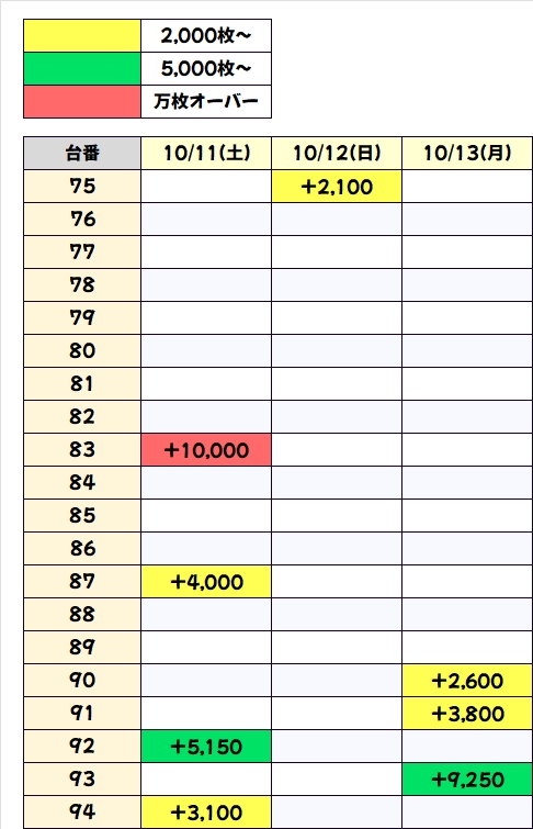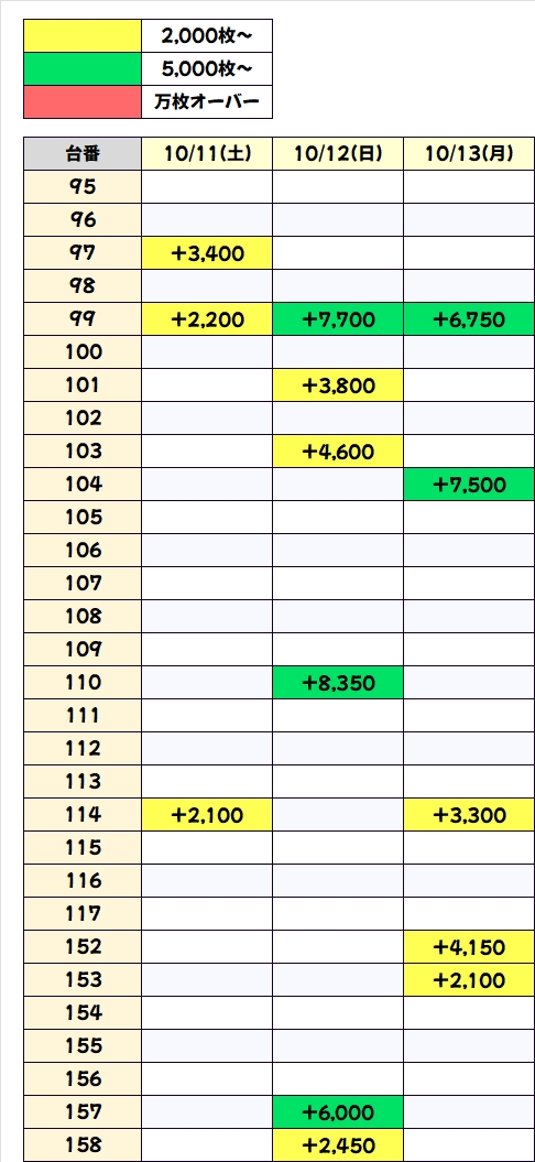 この日は万枚オーバー台が11台出現しており、108台が+3000枚オーバーと大量出玉が続出!