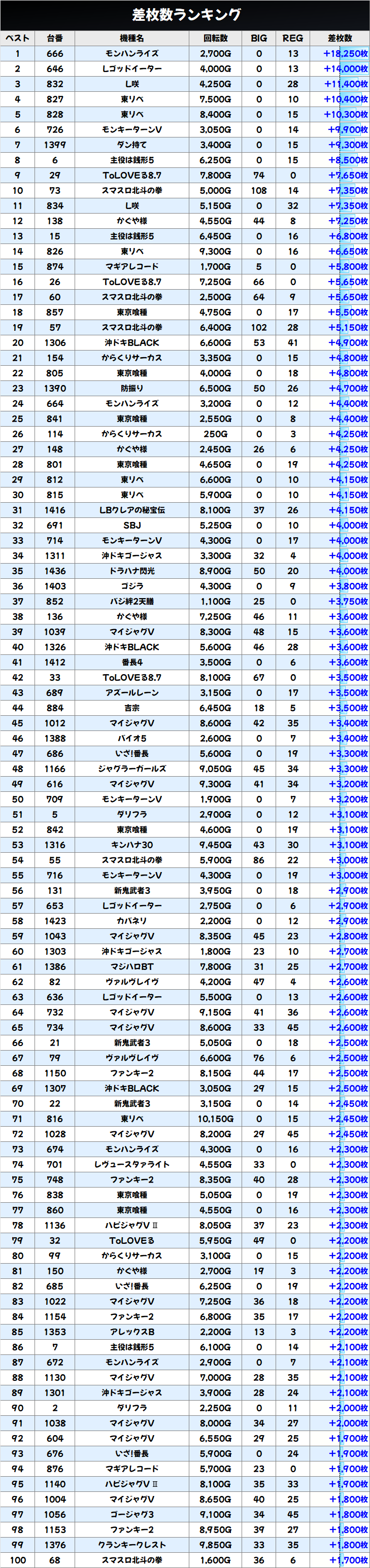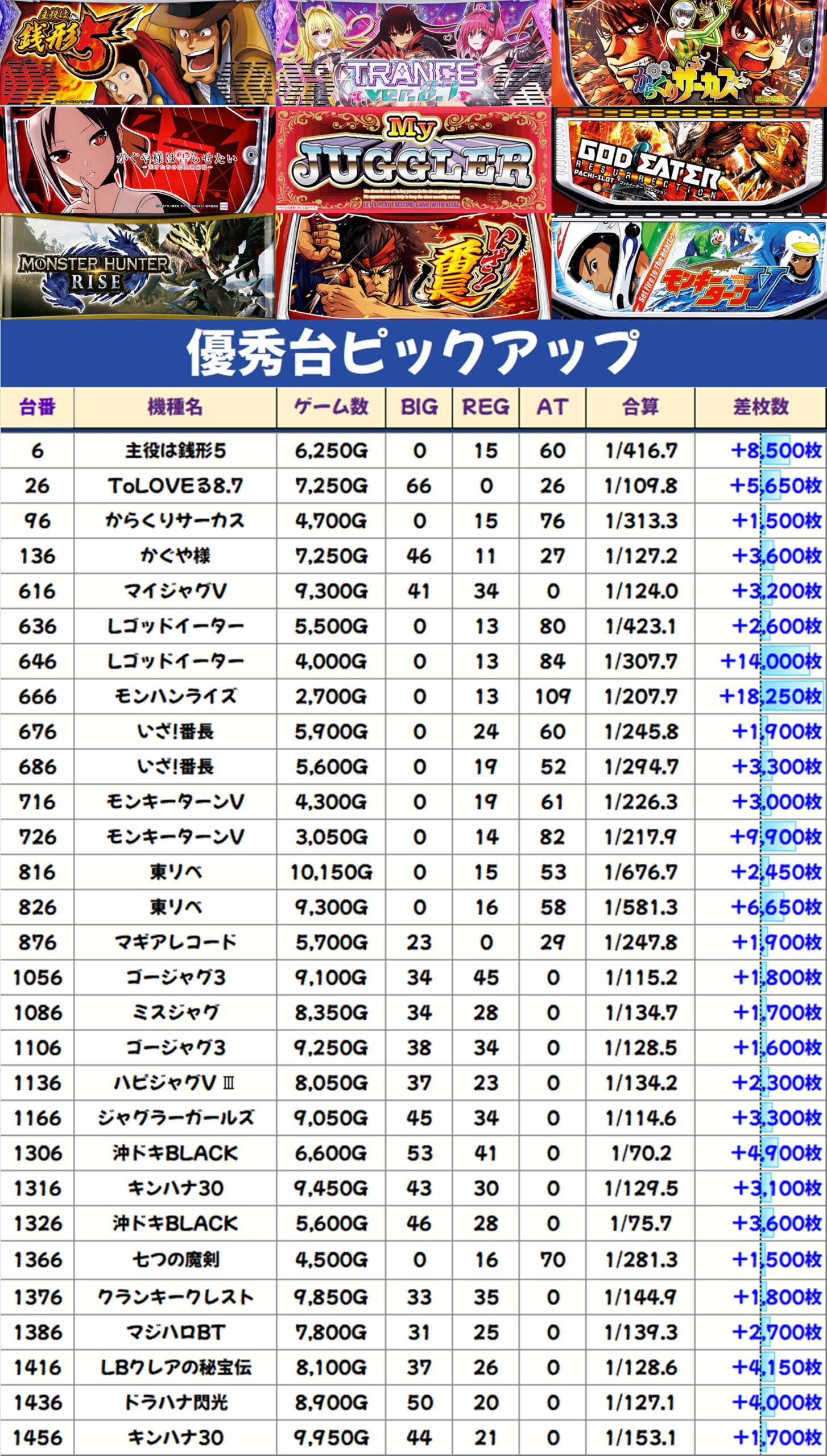 末尾⑥番台は、モンハンライズから+18250枚と爆裂台やLゴッドイーターから+14000枚と万枚オーバーも複数確認!
