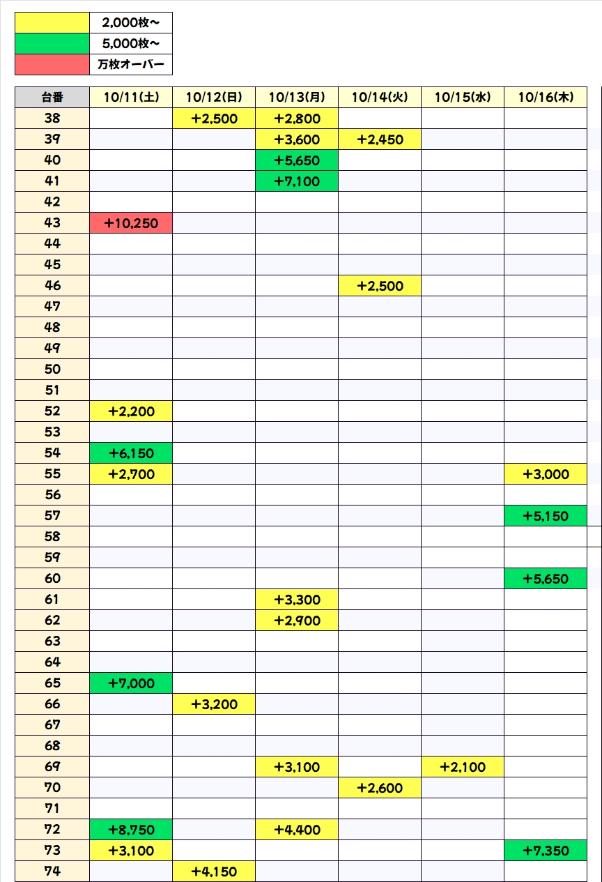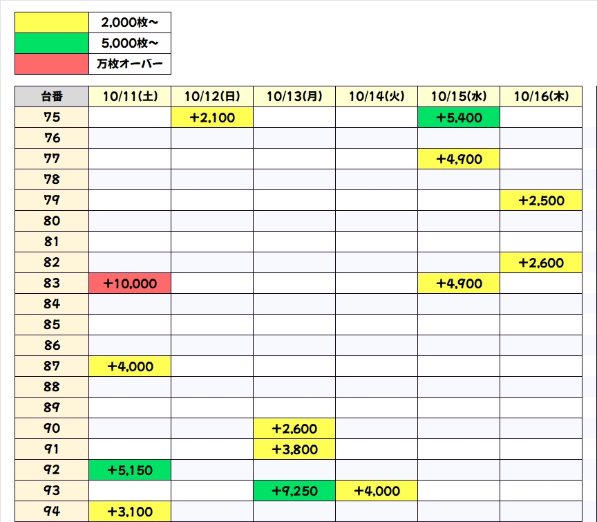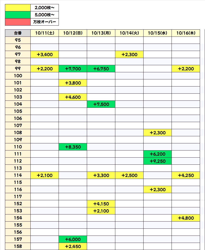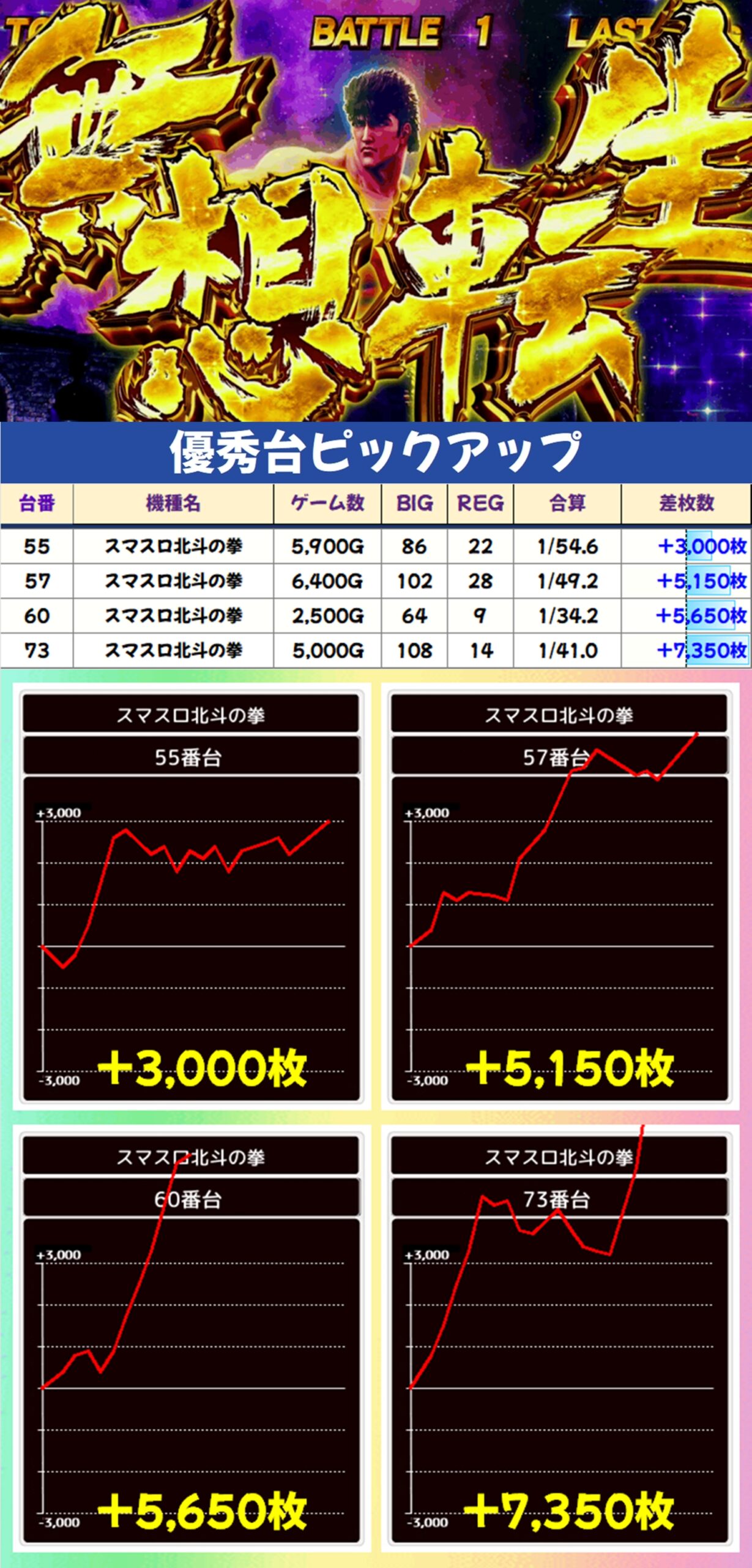 今回はスマスロ北斗の拳に並びの仕掛けがありましたが、それらも含めて各機種の優秀台(+2000枚以上)をピックアップしていきます。データをチェックして立ち回りの参考にしてください!