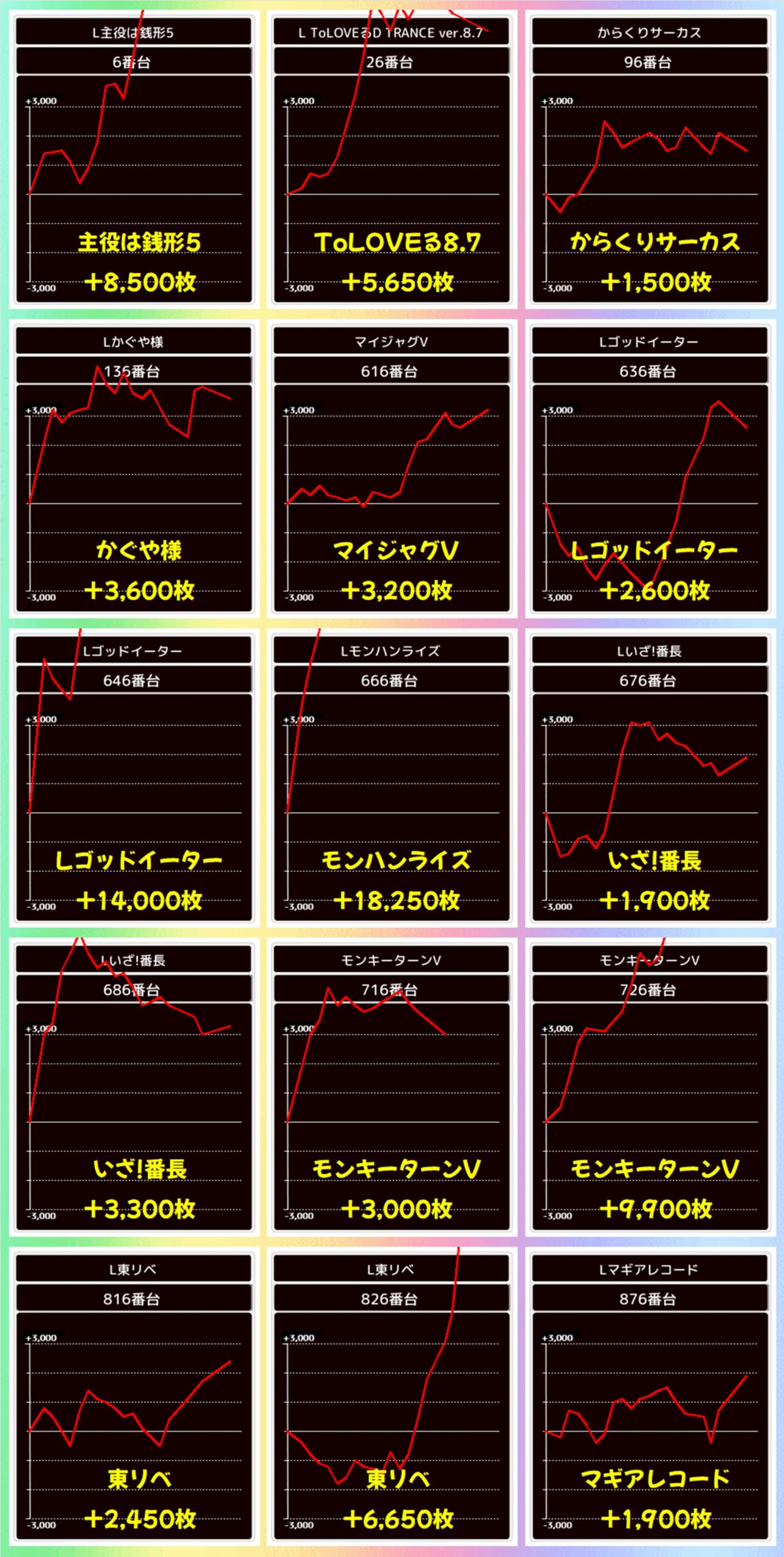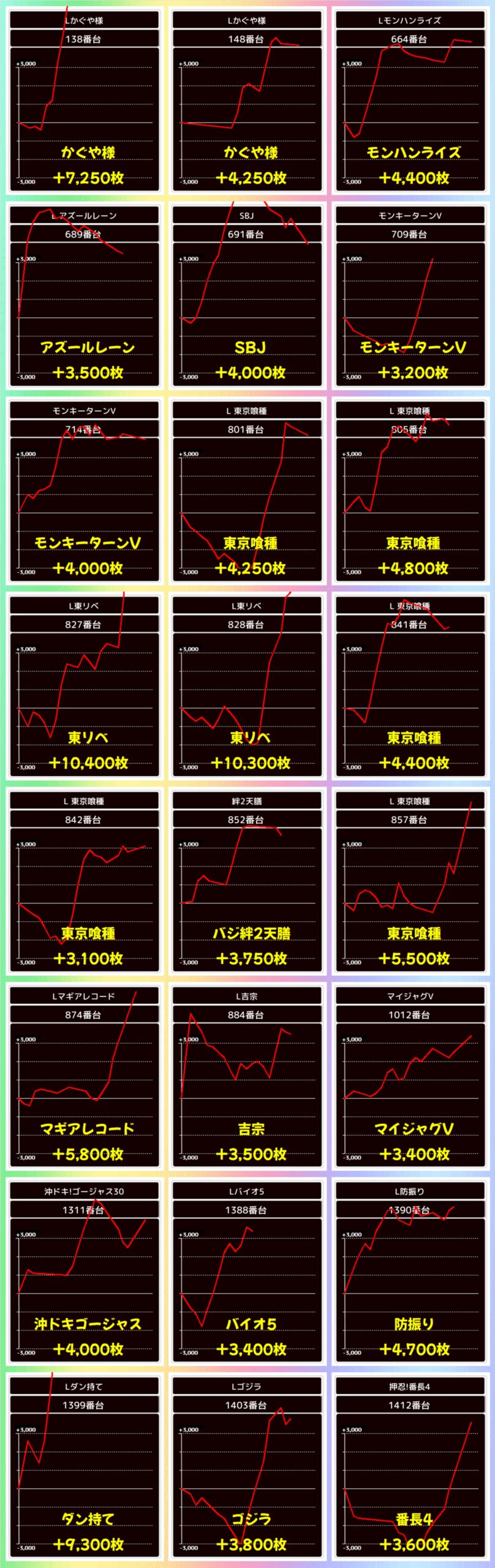 紹介してきた仕掛け以外からも多数のお宝台を確認でき、東リベからは+10400枚、+10300枚と単品の万枚オーバーが2台あり。その他、かぐや様、マギアレコード、ダン持てなど幅広い機種から優秀な出玉が出現しておりましたね!