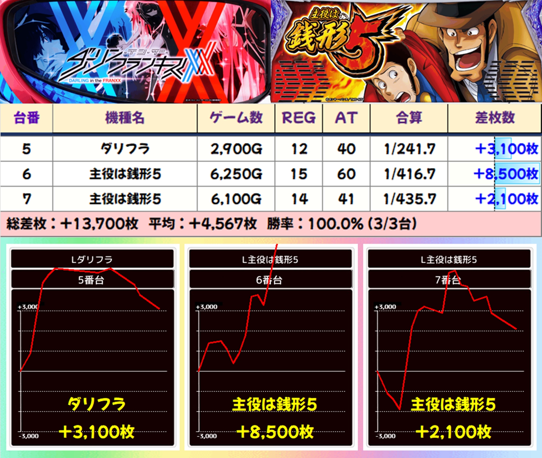 【3台並び】ダリフラ・主役は銭形5(5-7番台)→平均 +4,567枚