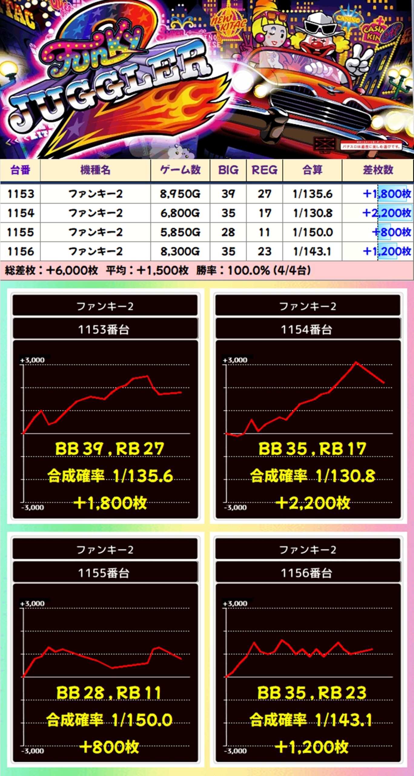 【4台並び】ファンキー2(1153-1156番台)→平均 +1,500枚