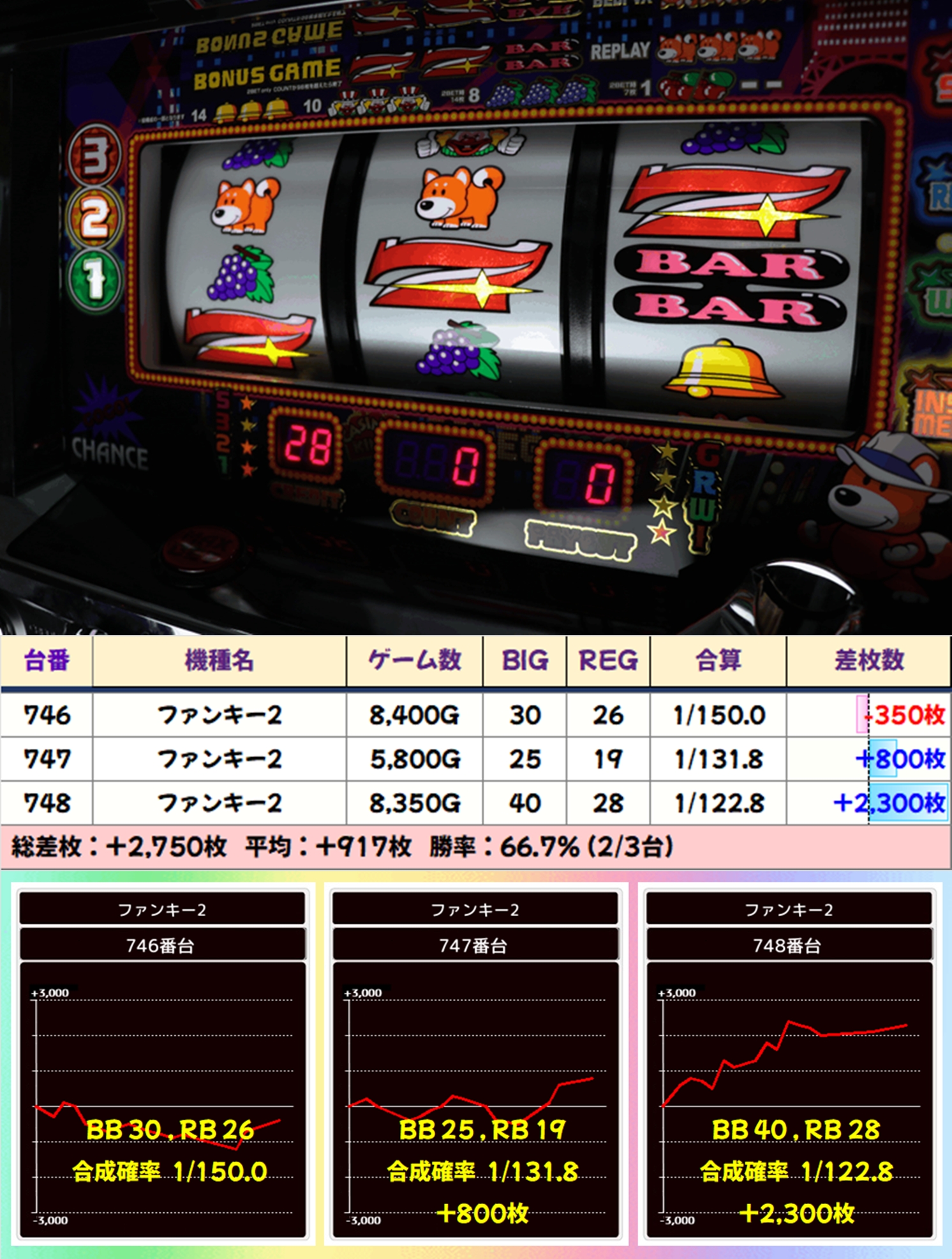 【3台並び】ファンキー2(746-748番台)→平均 +917枚