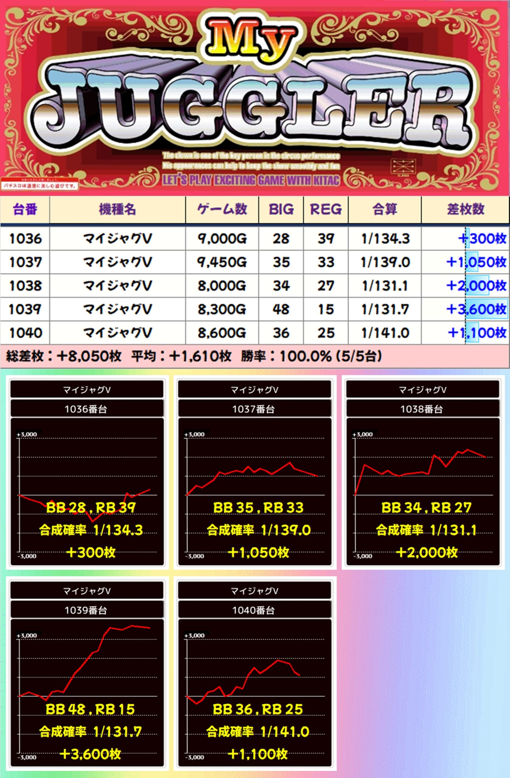 【5台並び】マイジャグV(1036-1040番台)→平均 +1,610枚