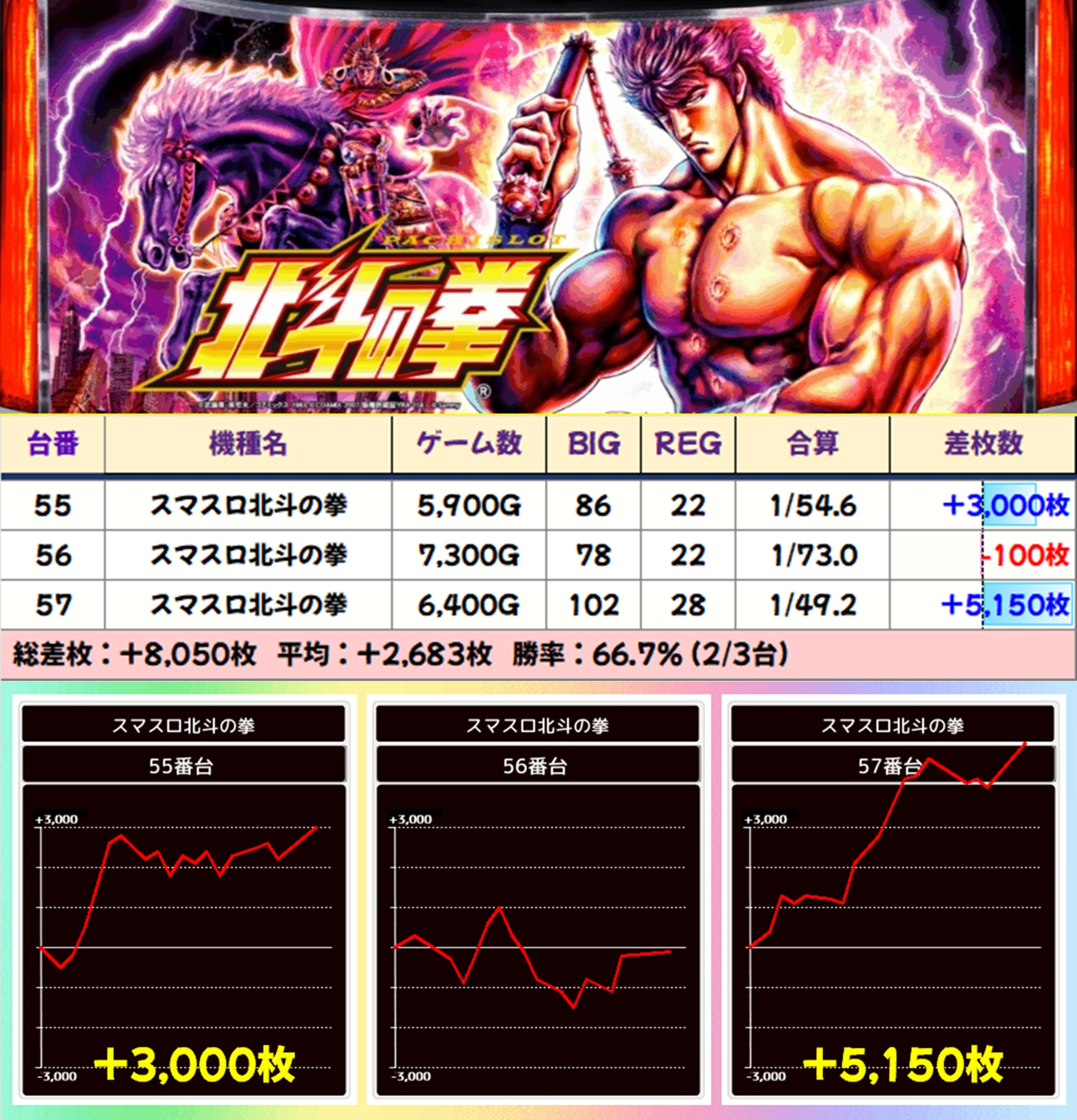 【3台並び】スマスロ北斗の拳(55-57番台)→平均 +2,683枚