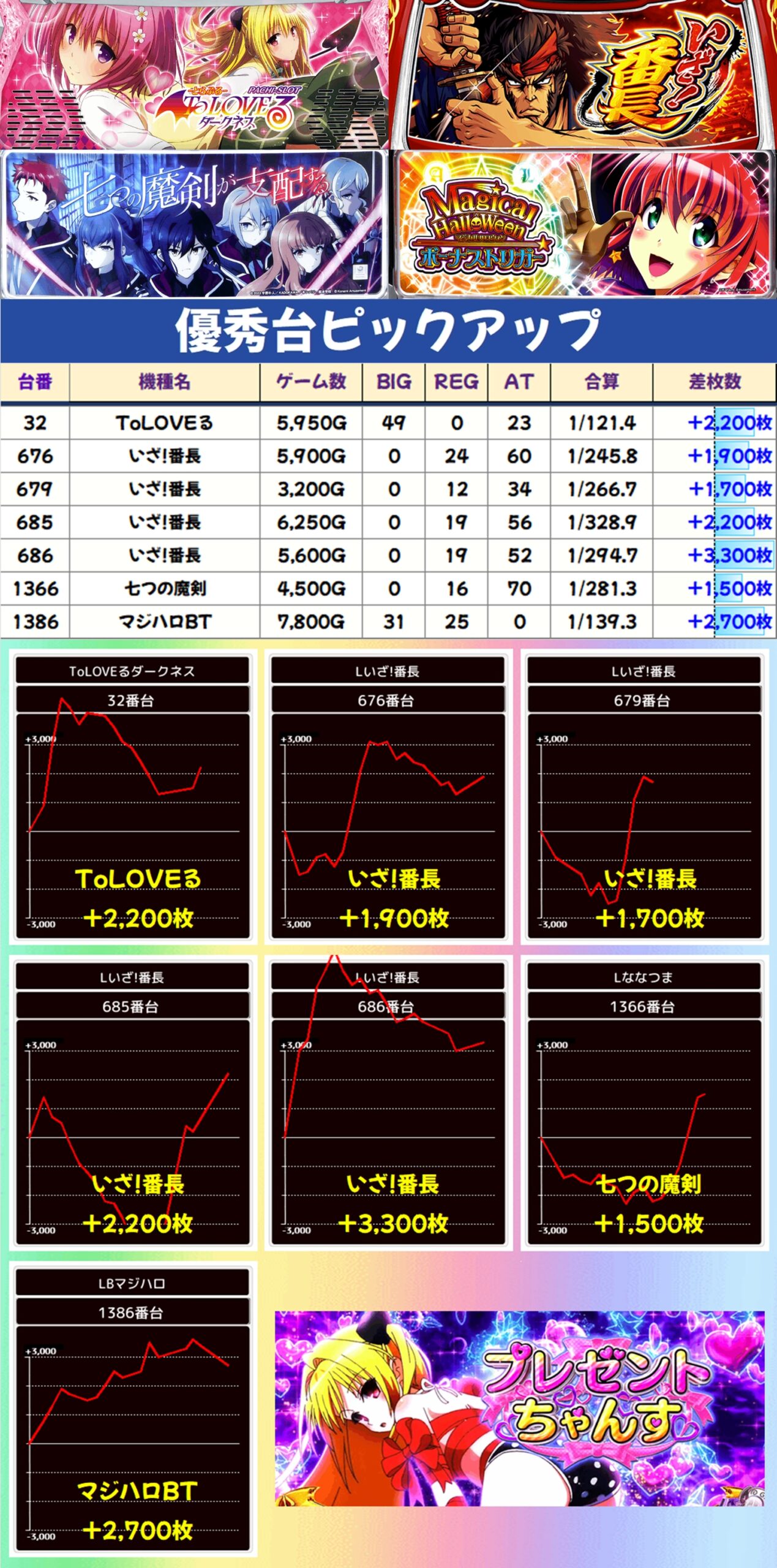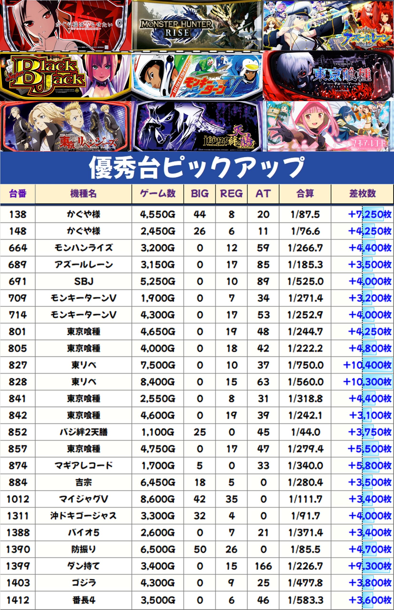 各機種の優秀台をピックアップしていきますので、データを確認してみましょう!
