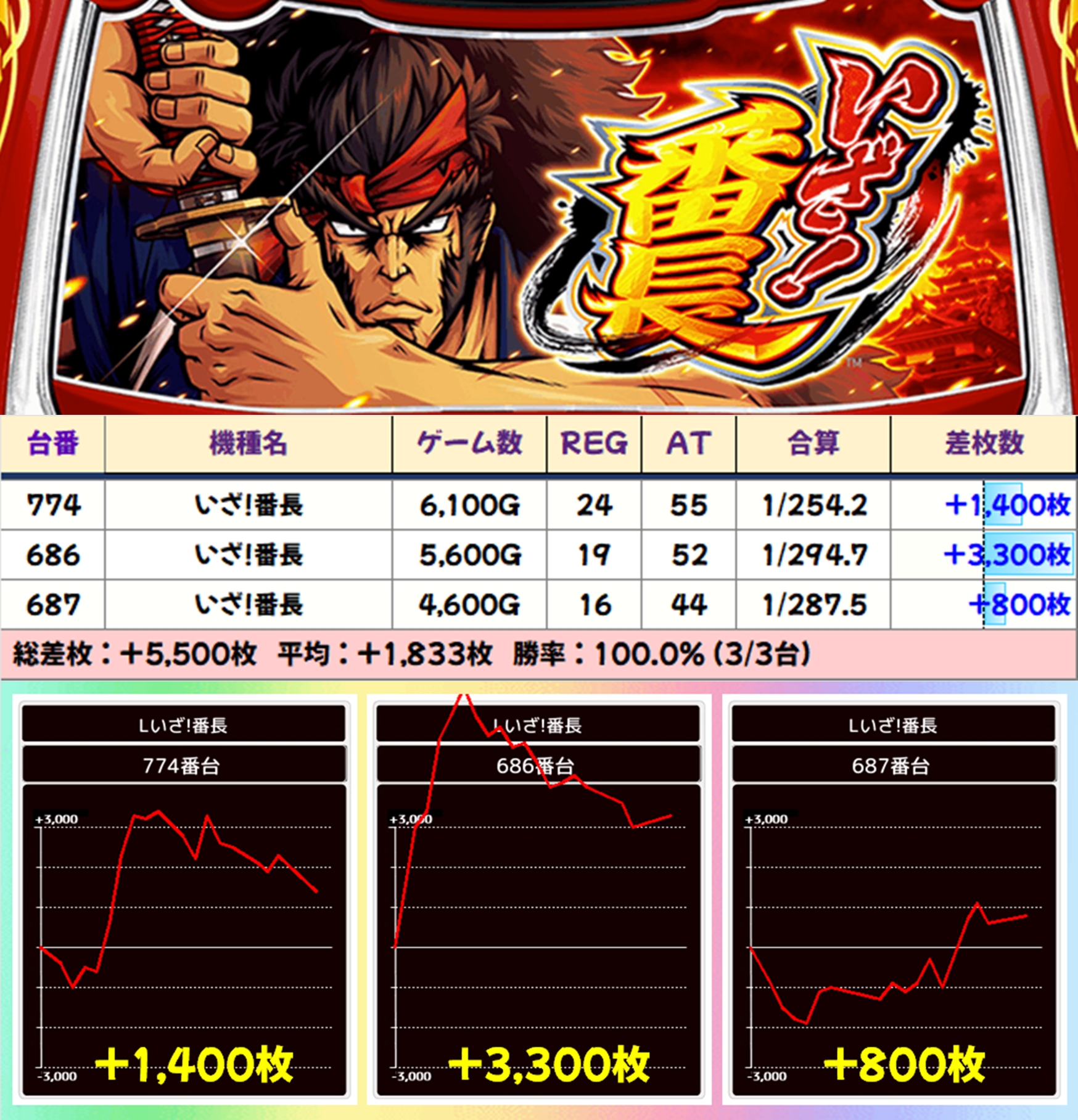 【3台並び】いざ!番長(774、686-687番台)→平均 +1,833枚