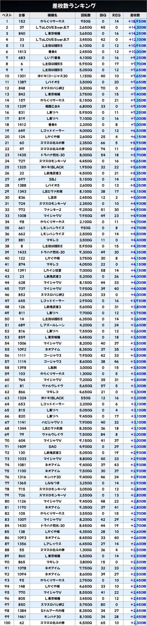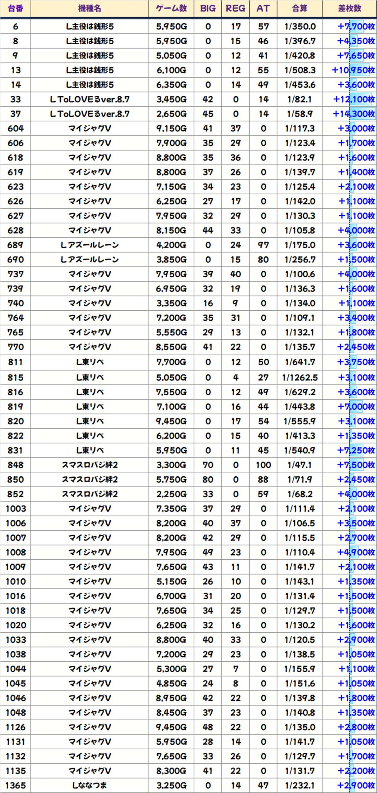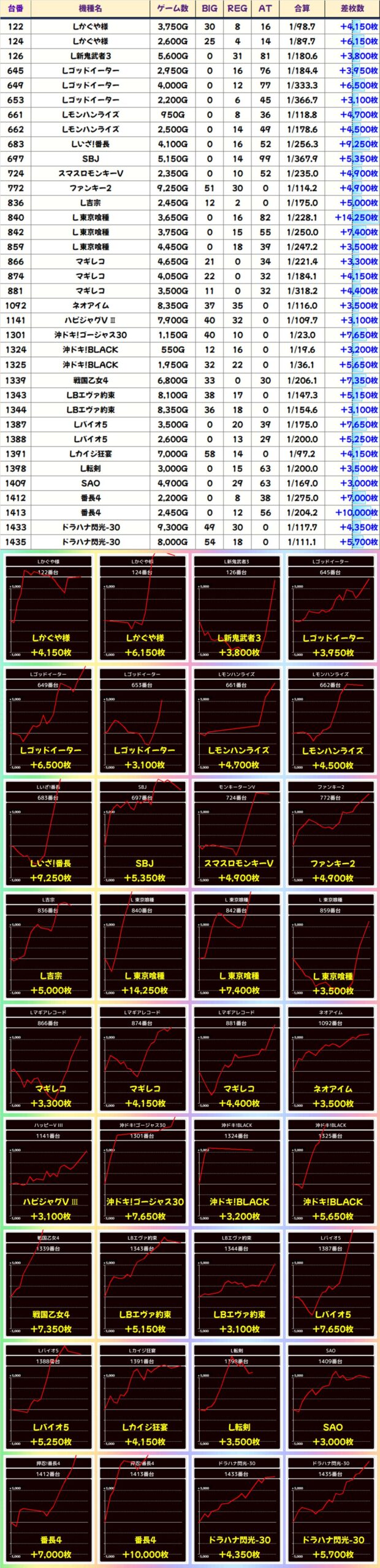 各機種の1000枚以上の優秀台をピックアップしていきますので、データをチェックしてみてください