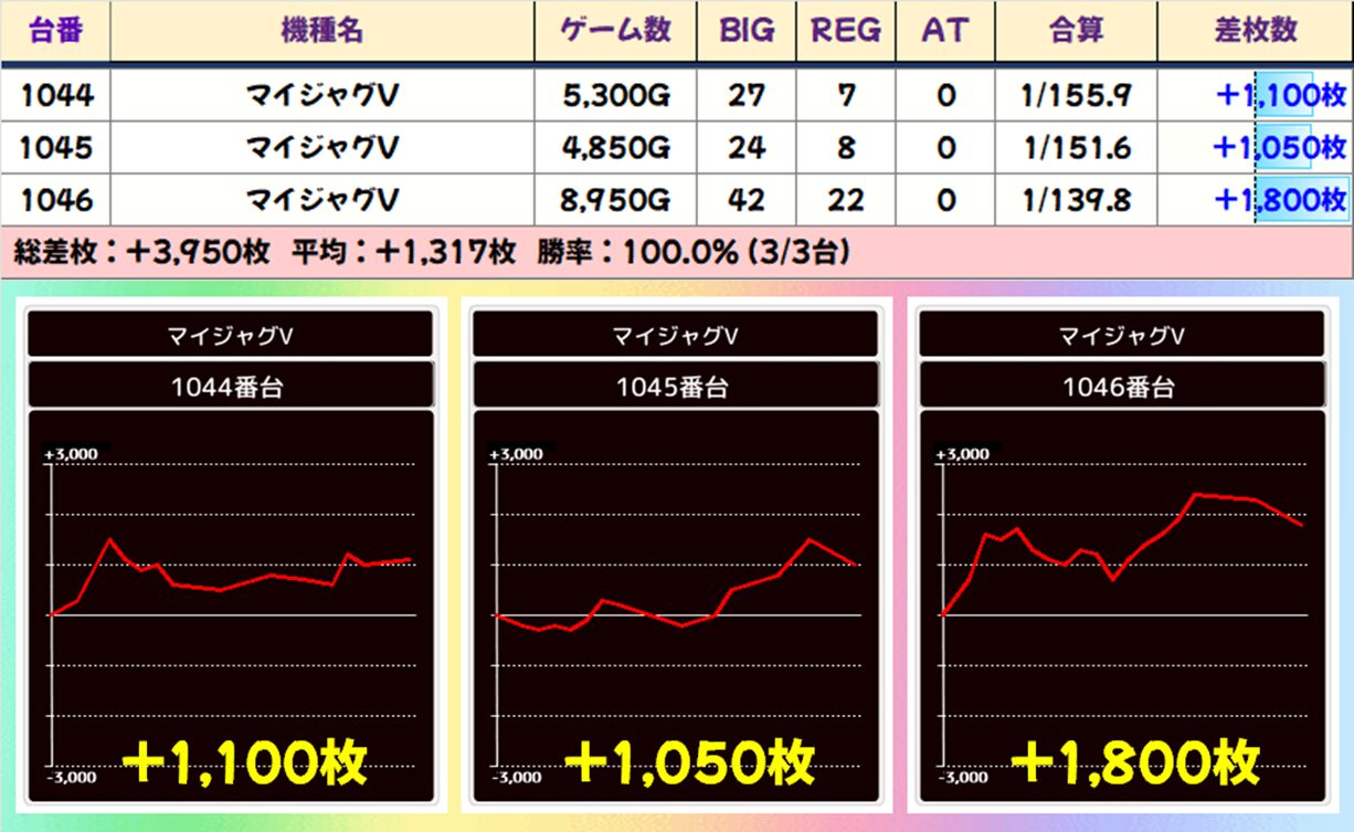 【3台並び】マイジャグラーV(1044~1046)➡平均+1,317枚
