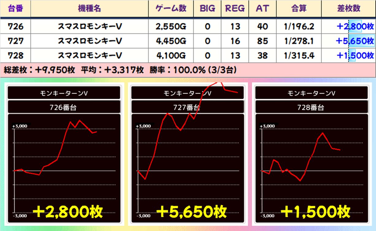 【3台並び】LモンキーターンV(726~728)➡平均+3,317枚