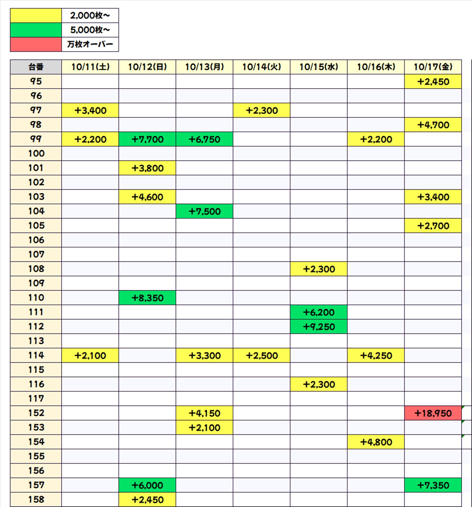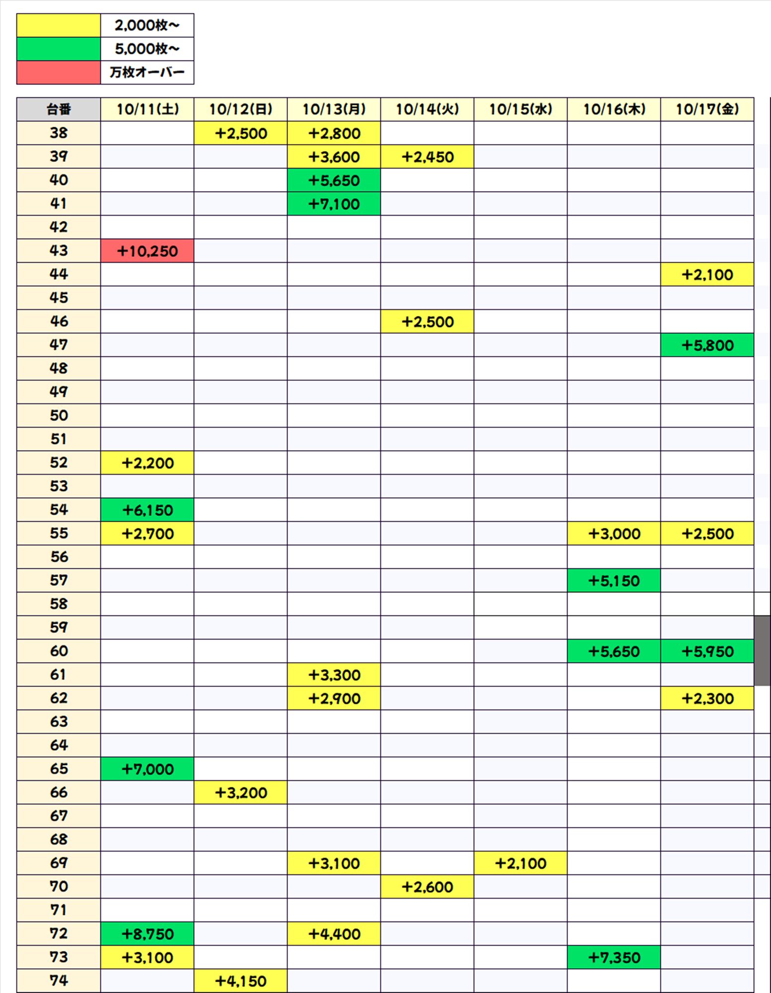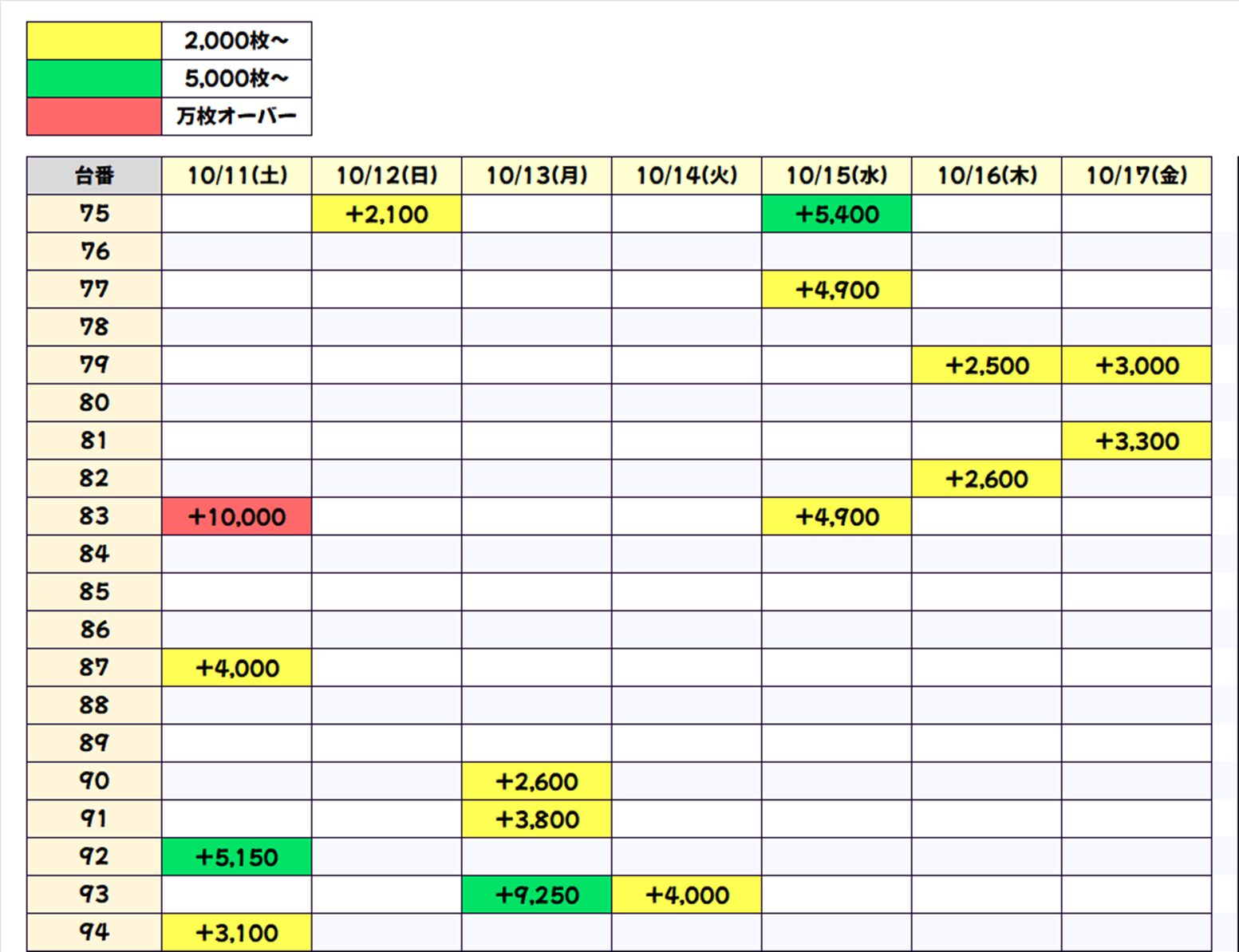 今回は7のつく日である10/17の結果をレポート!7のつく日は3台以上設置機種からお宝台が出現しやすい傾向があります。