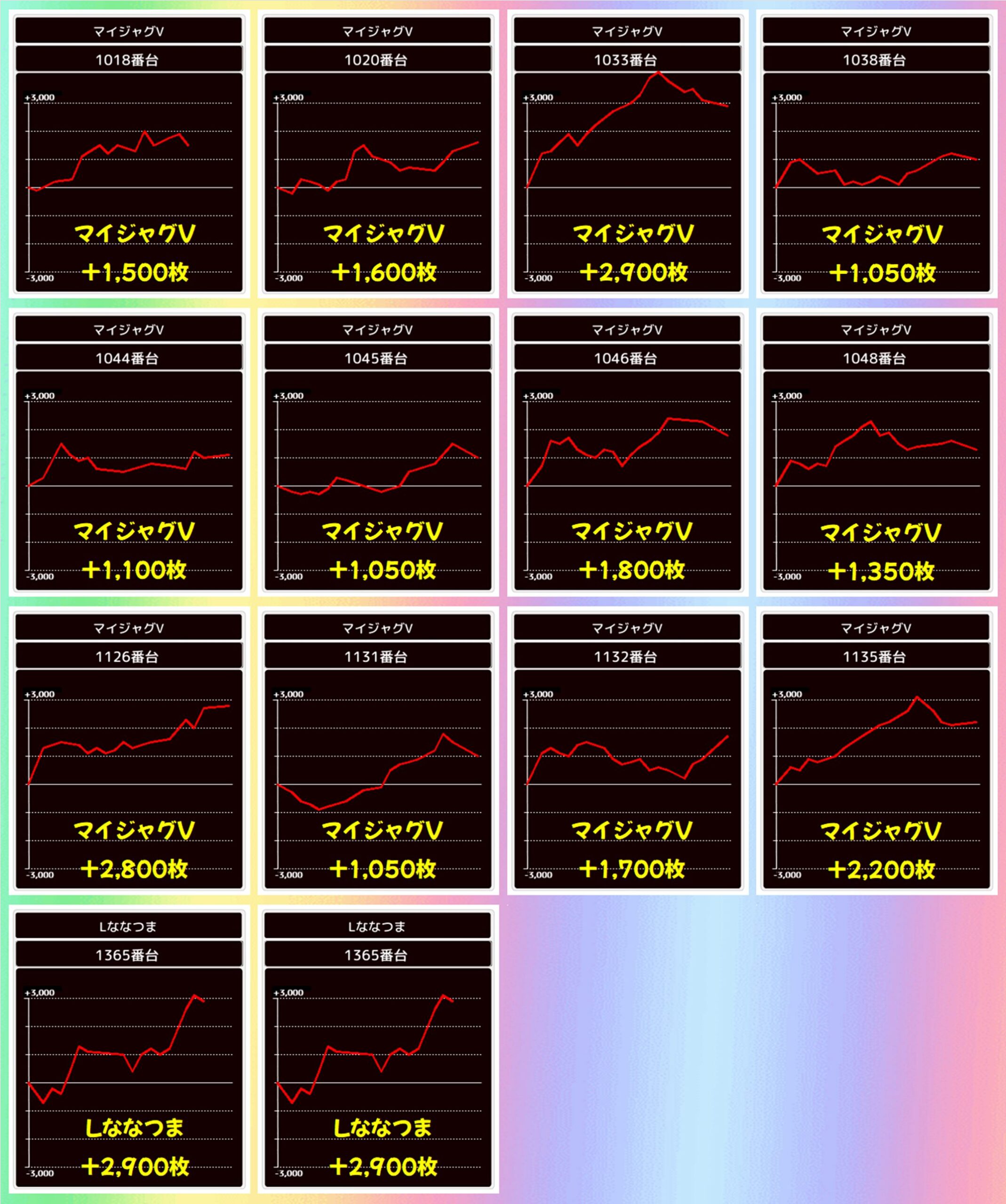 主に多台数機種から並びが出現し、大半が平均1000枚以上の優秀並びでした。とくにマイジャグは並びに絡むことが多いので、このあたりを狙う際は優秀台のサイドも意識!