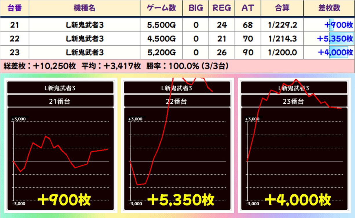 【3台並び】L新鬼武者3(21~23)➡平均+3,400枚