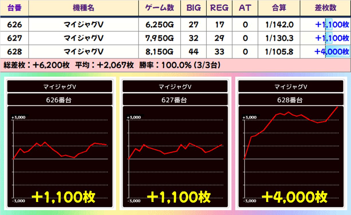 【3台並び】マイジャグラーV(626~628)➡平均+2,070枚