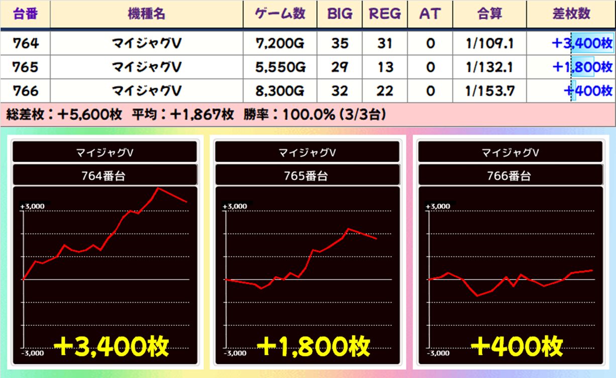 【3台並び】マイジャグラーV(764~766)➡平均+1,870枚