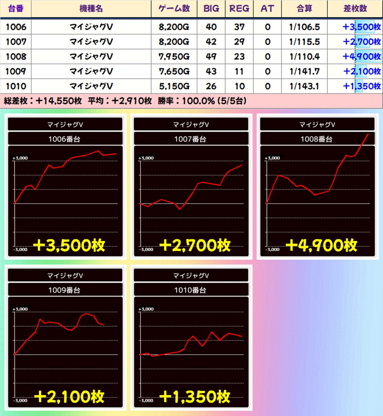 【5台並び】マイジャグラーV(1006~1010)➡平均+2,920枚